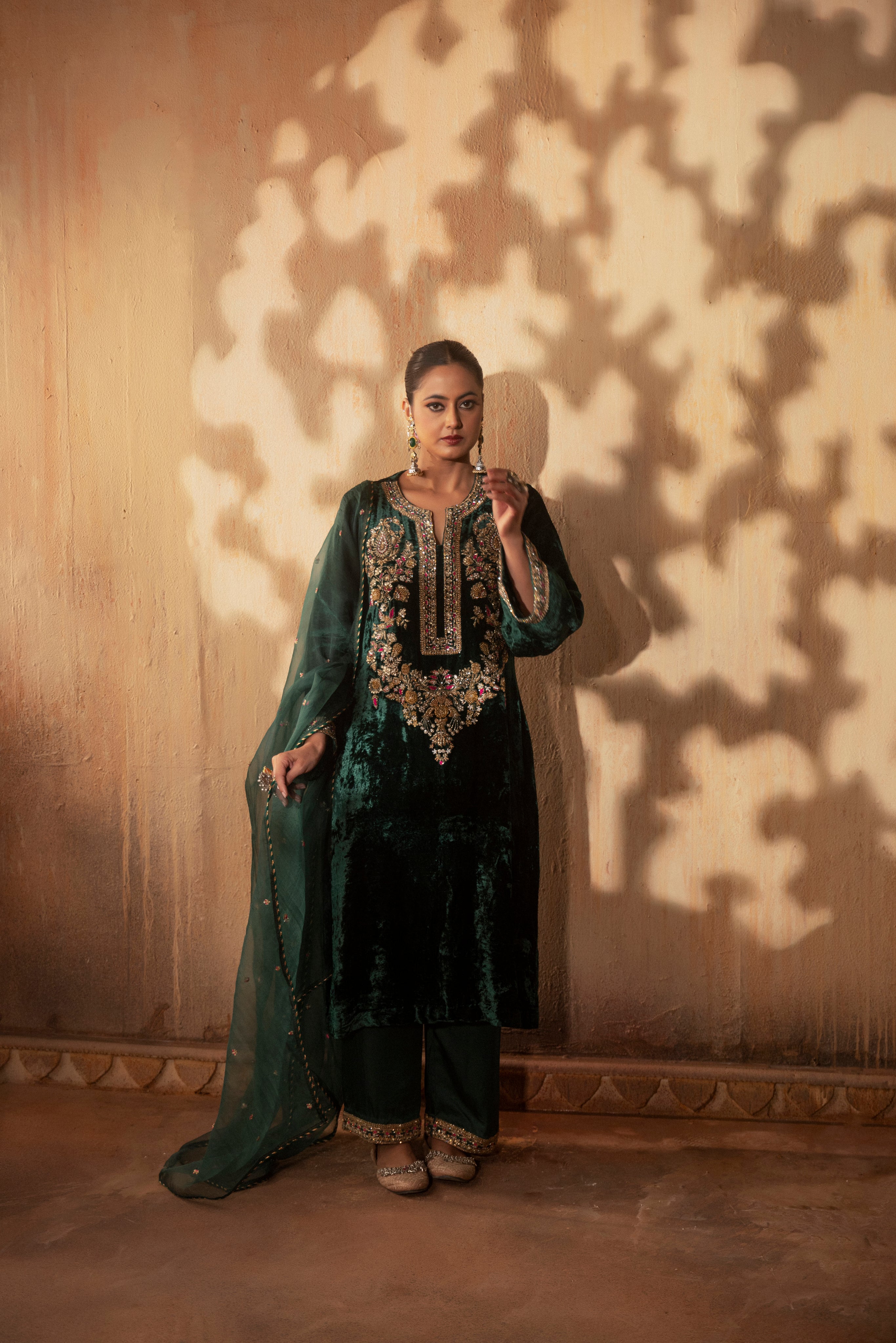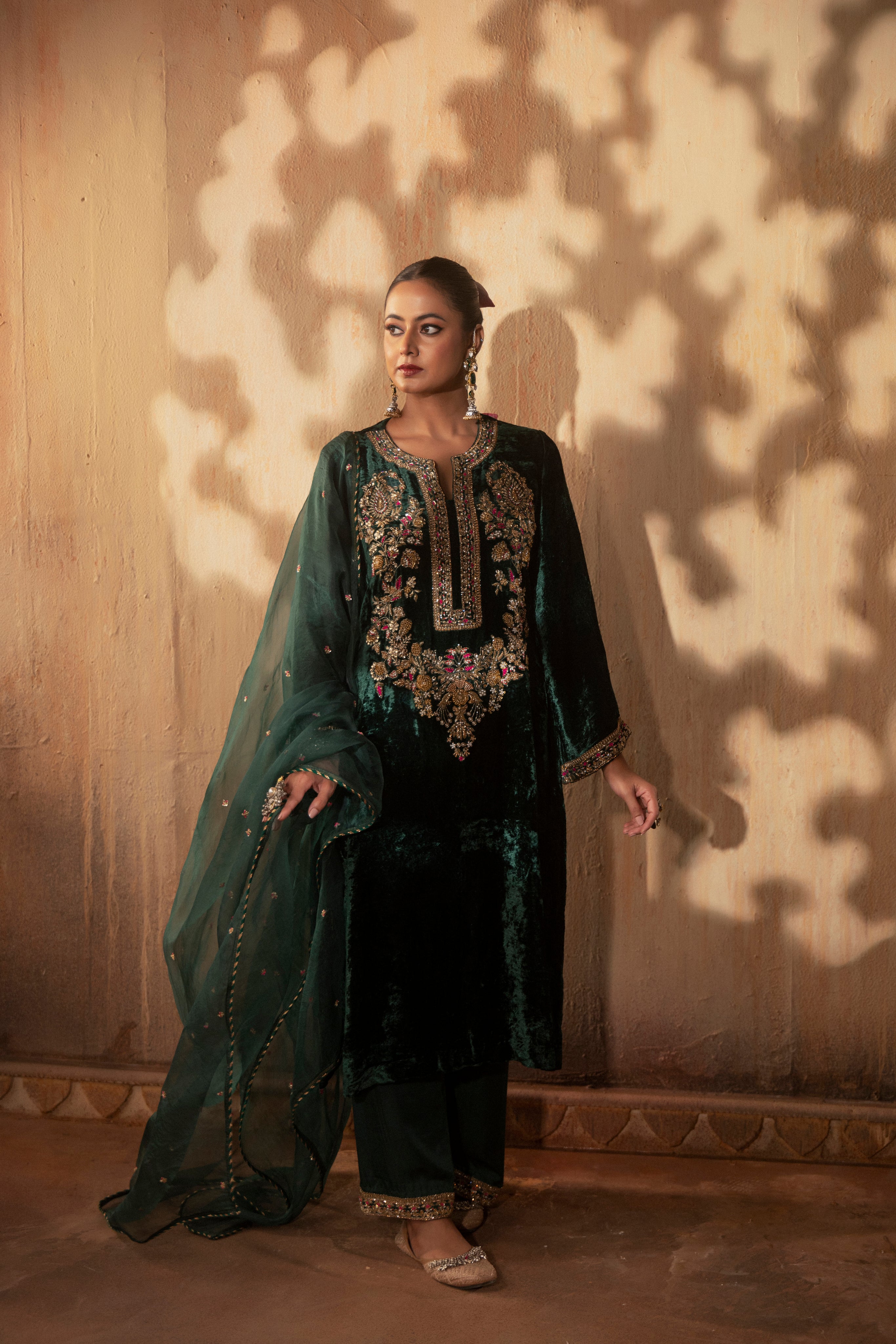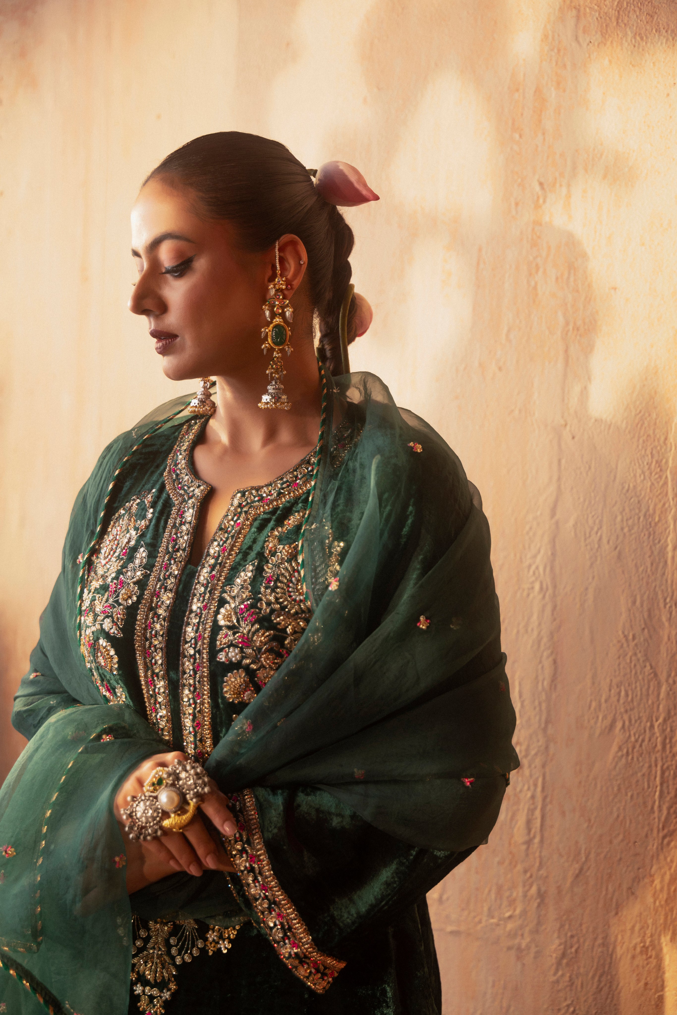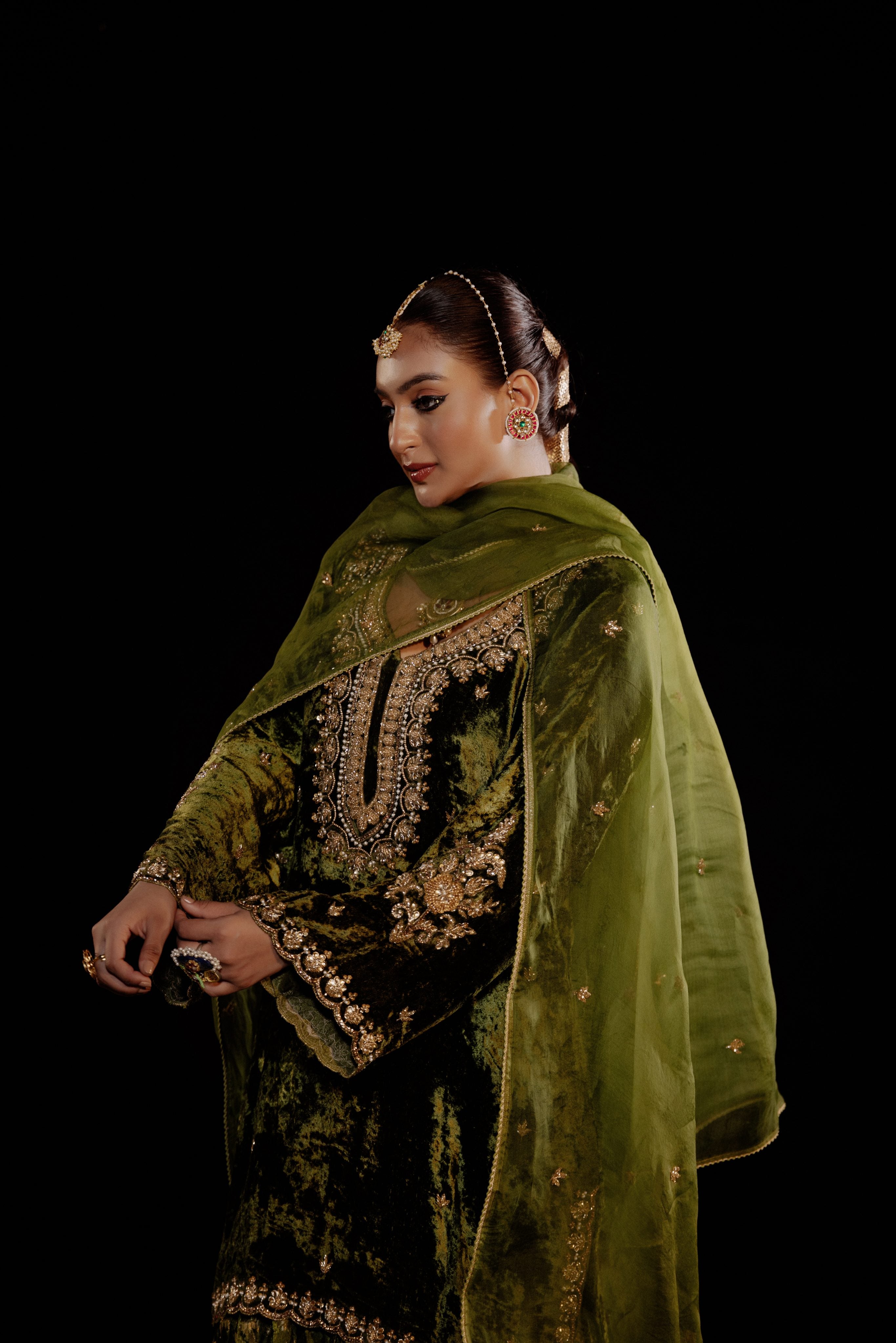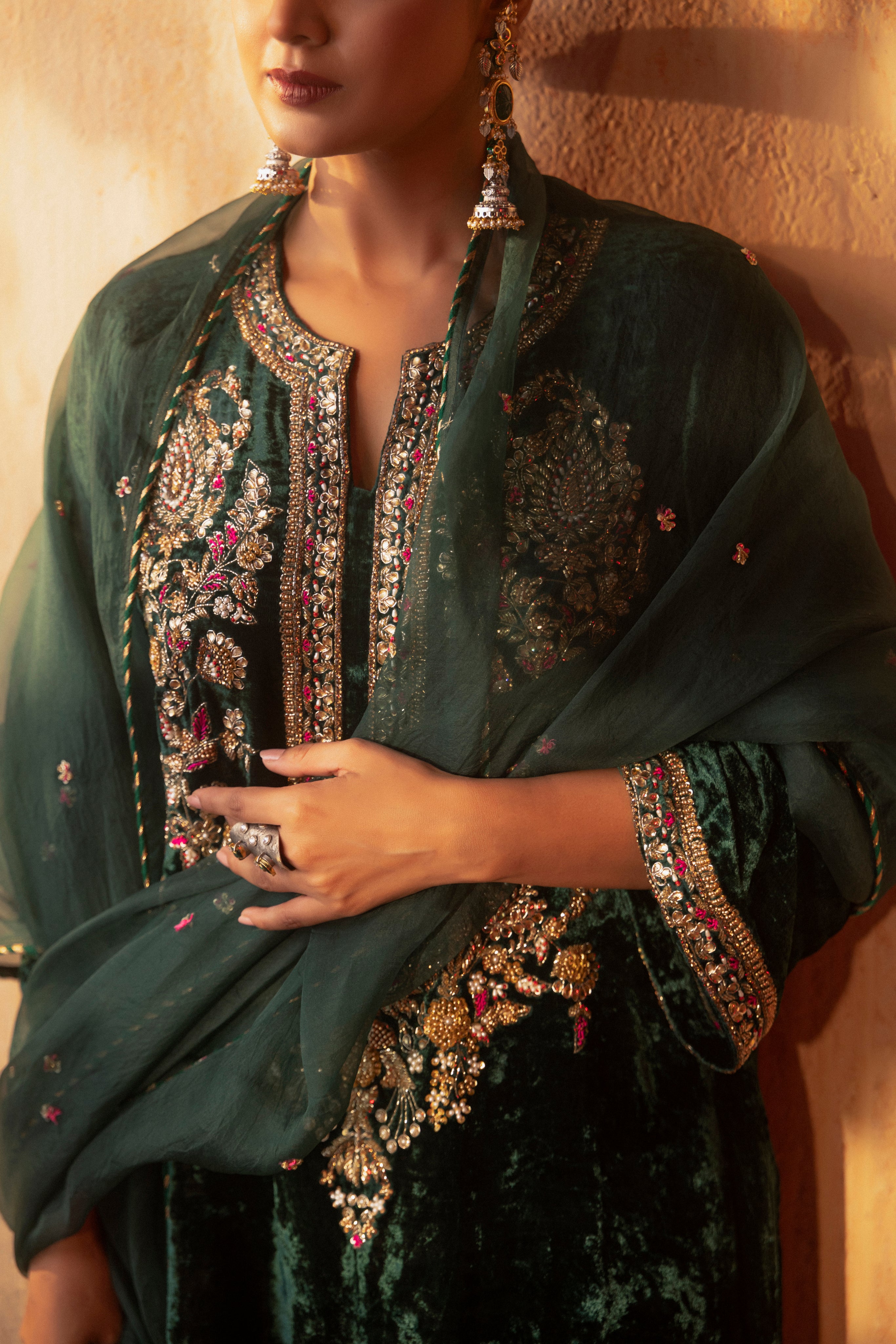 The Bottle Green Velvet Pakistani Suit Set from Gul is simply stunning. The intricate hand embroidery with zardozi, aari and cutdana work is absolutely exquisite and makes it perfect for weddings or other formal events. The velvet fabric is also very luxurious and comfortable to wear.