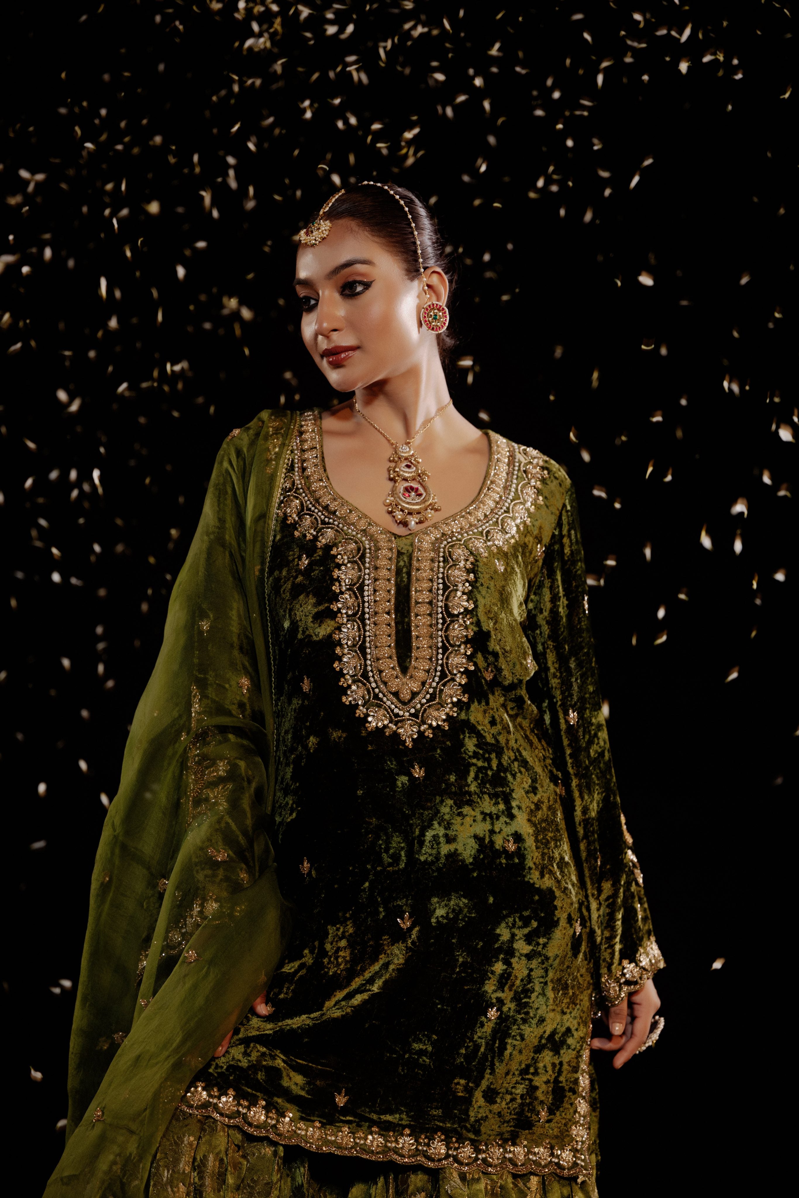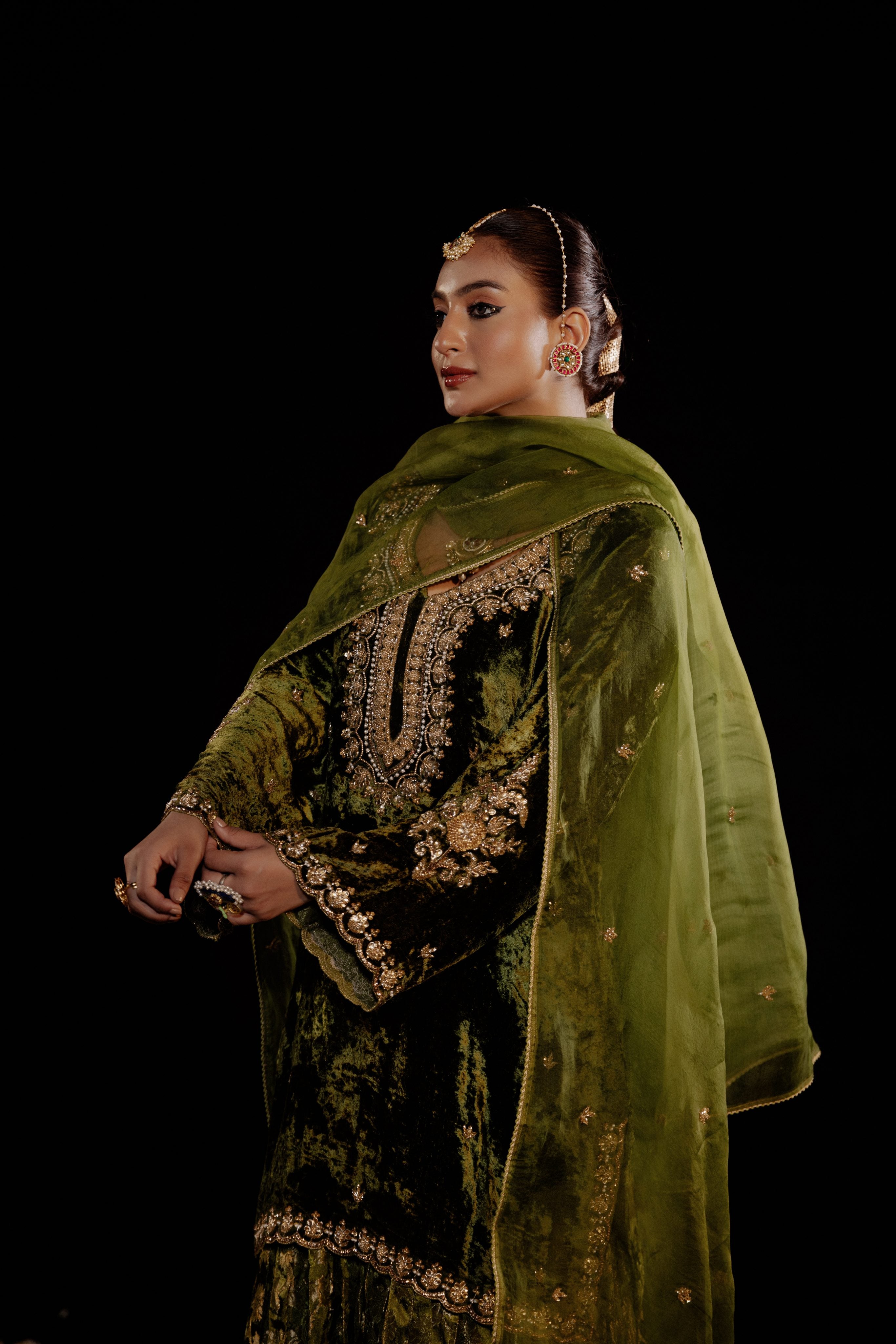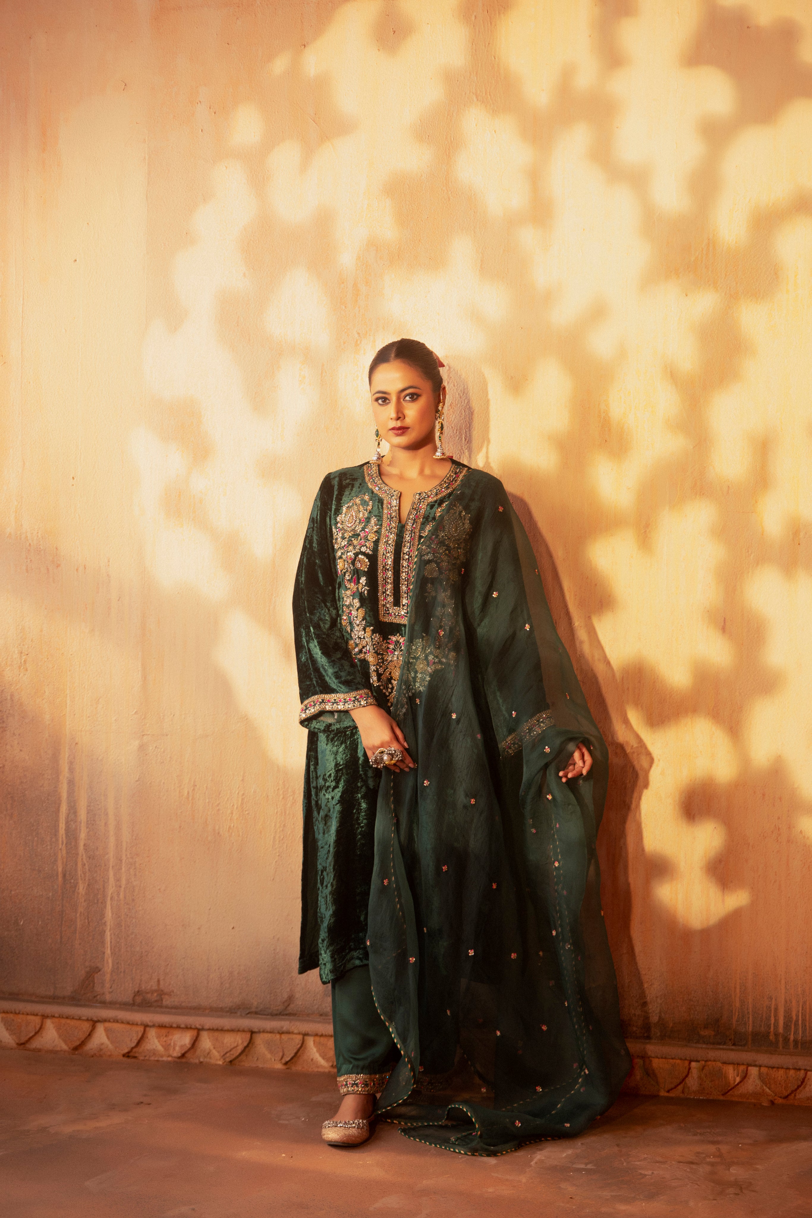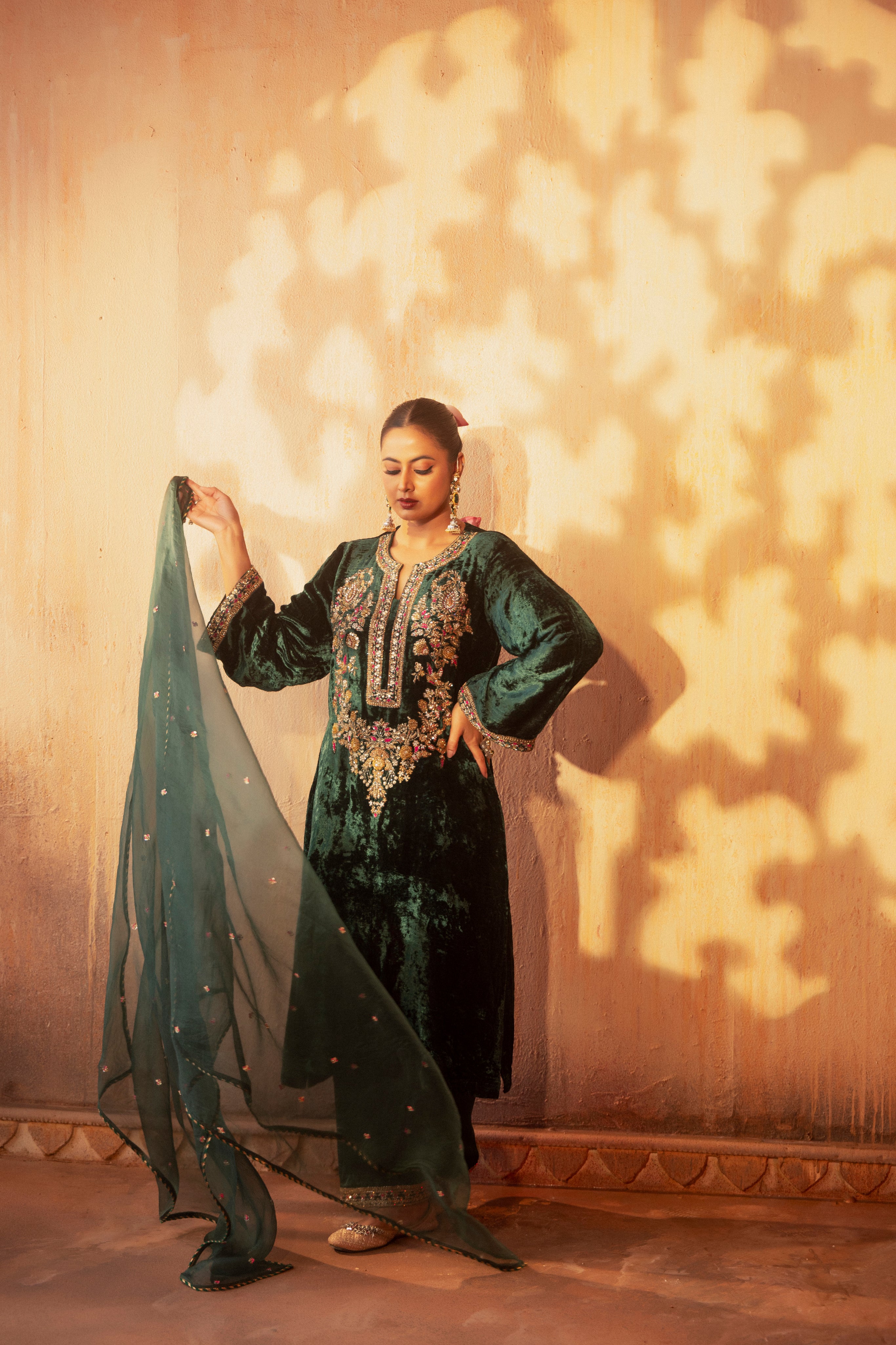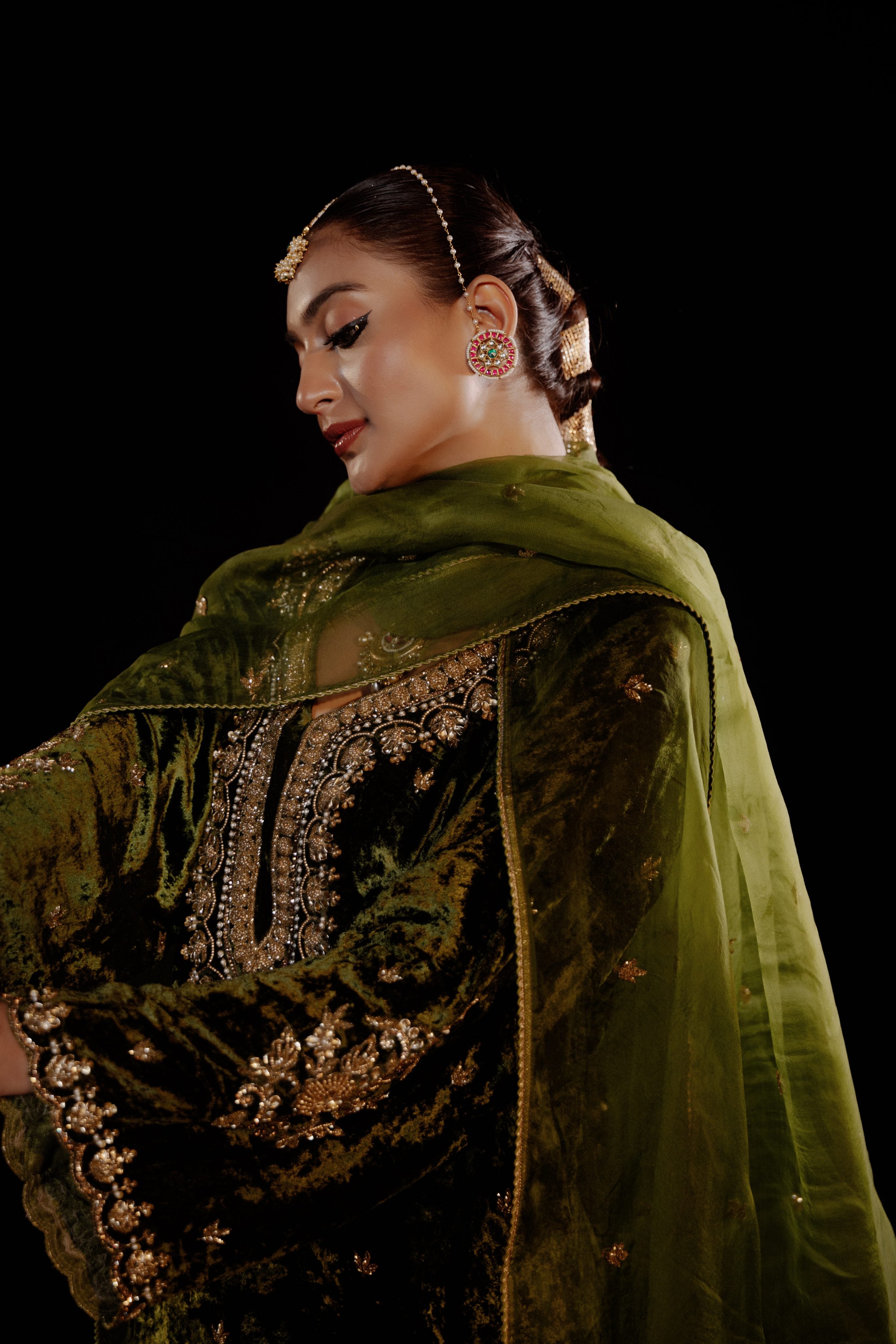 The Bottle Green Velvet Pakistani Suit Set from Gul is simply stunning. The intricate hand embroidery with zardozi, aari and cutdana work is absolutely exquisite and makes it perfect for weddings or other formal events. The velvet fabric is also very luxurious and comfortable to wear.