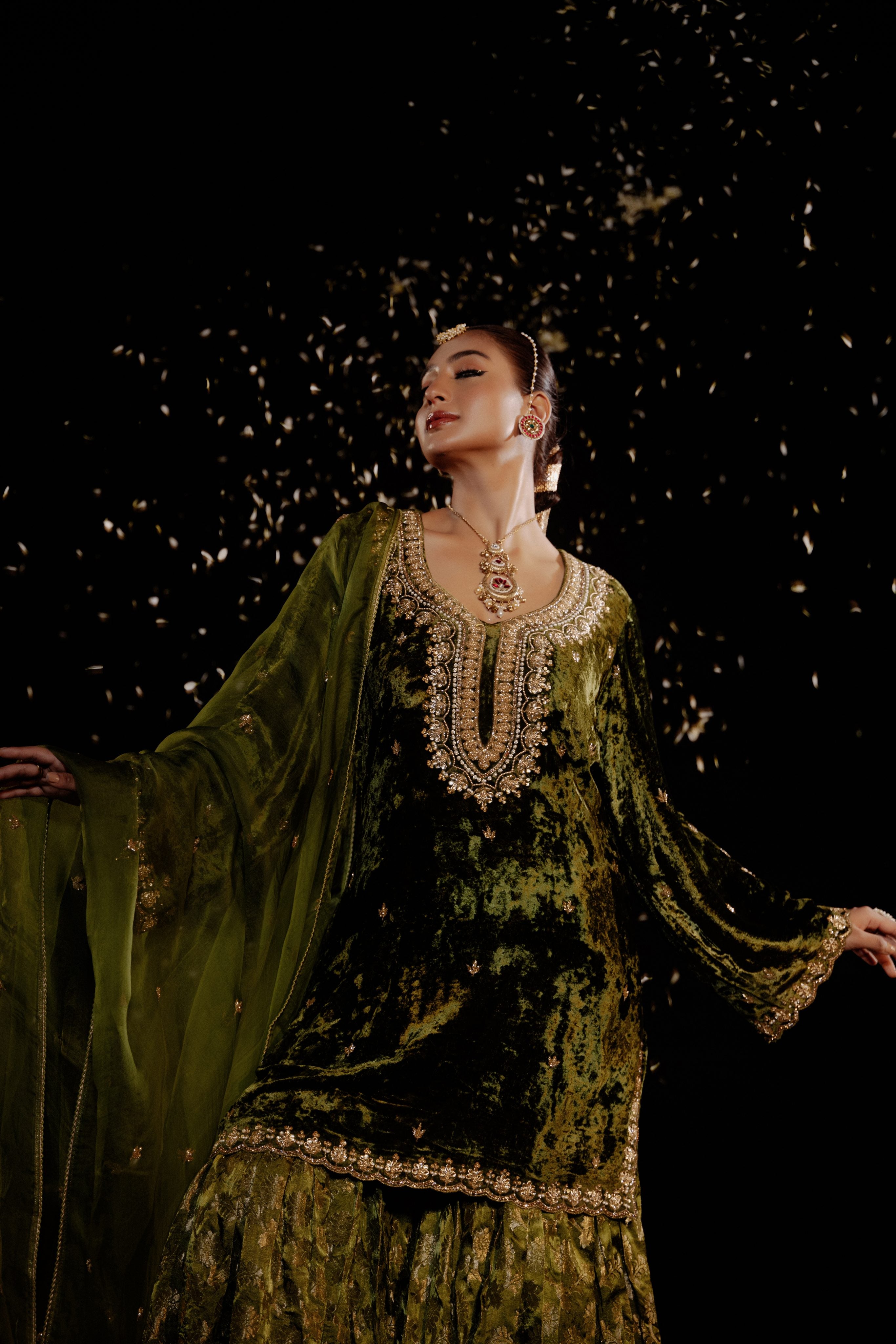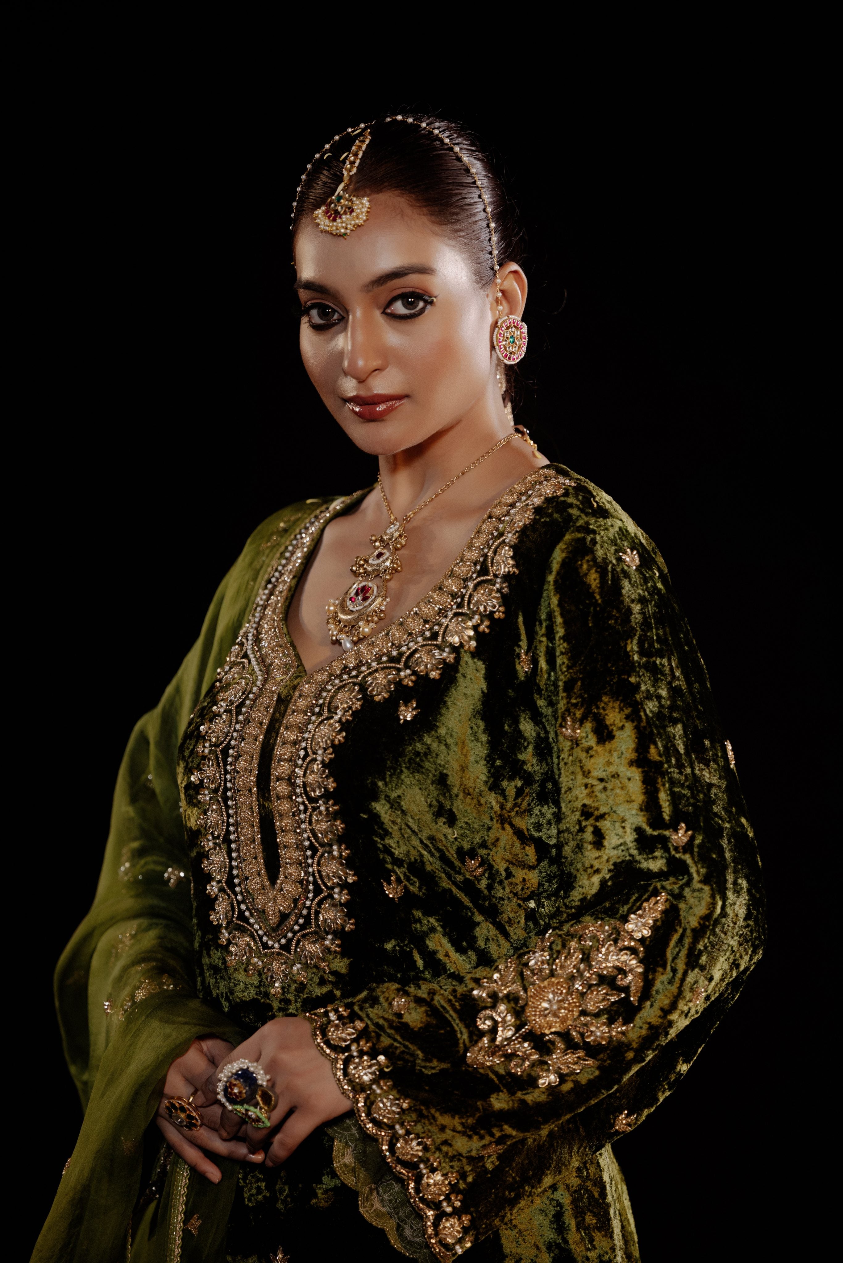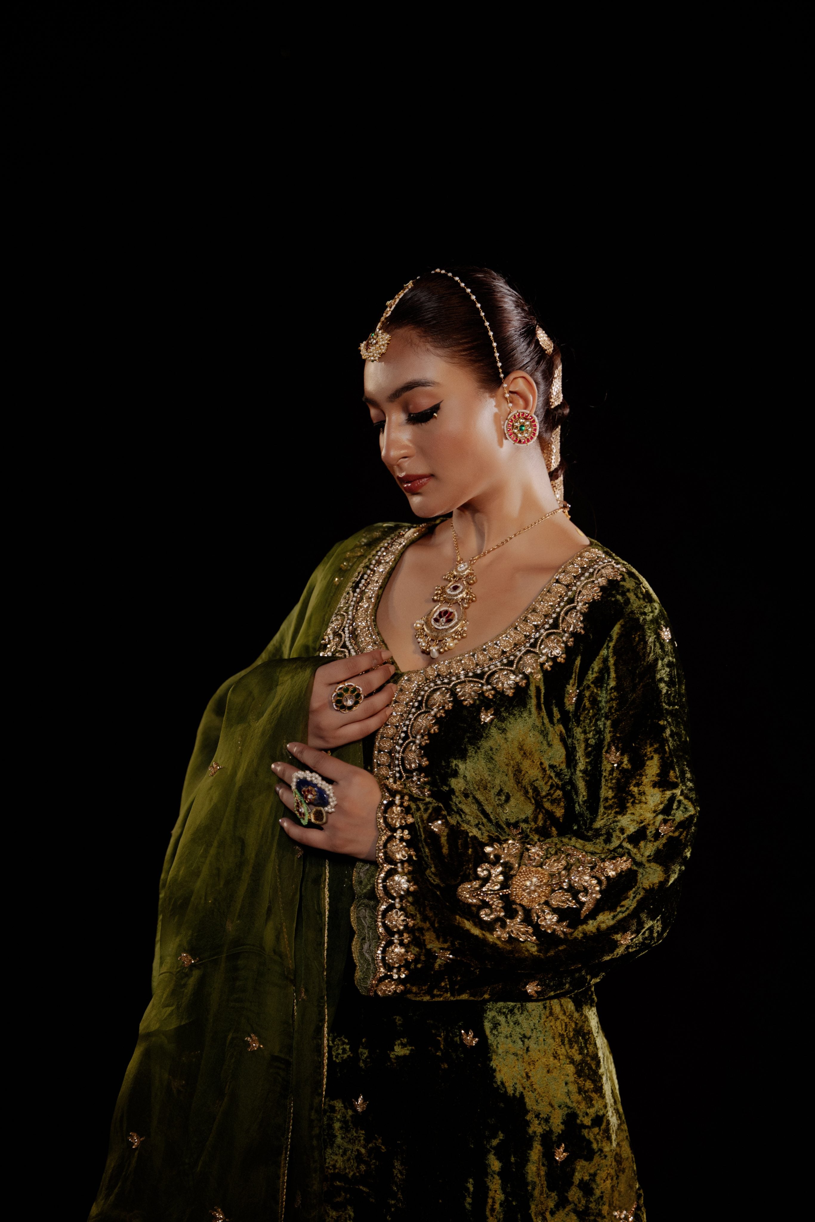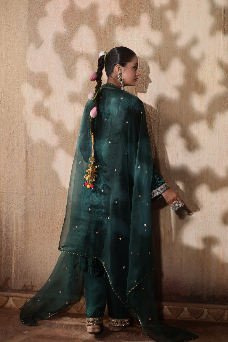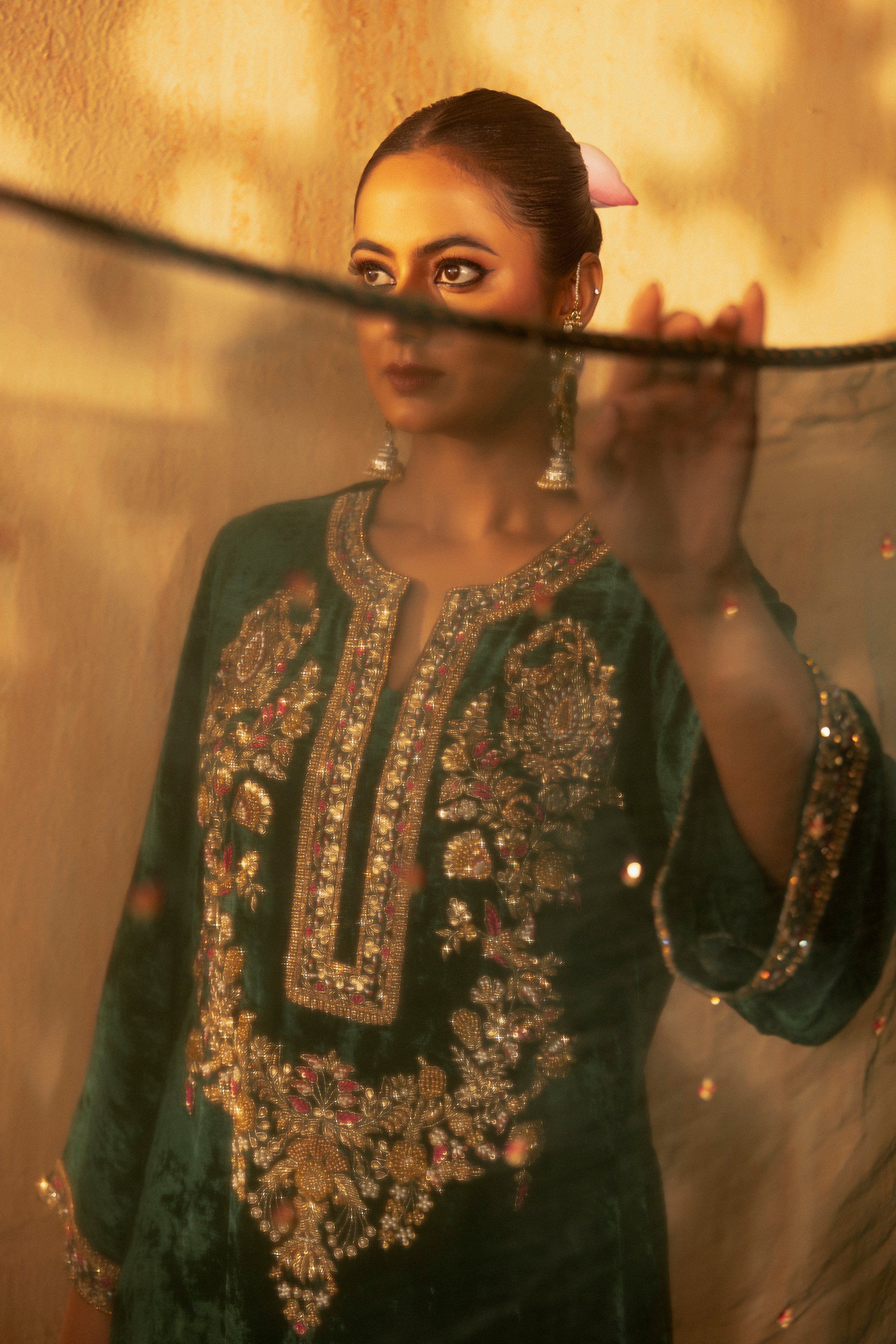 The Bottle Green Velvet Pakistani Suit Set from Gul is simply stunning. The intricate hand embroidery with zardozi, aari and cutdana work is absolutely exquisite and makes it perfect for weddings or other formal events. The velvet fabric is also very luxurious and comfortable to wear.