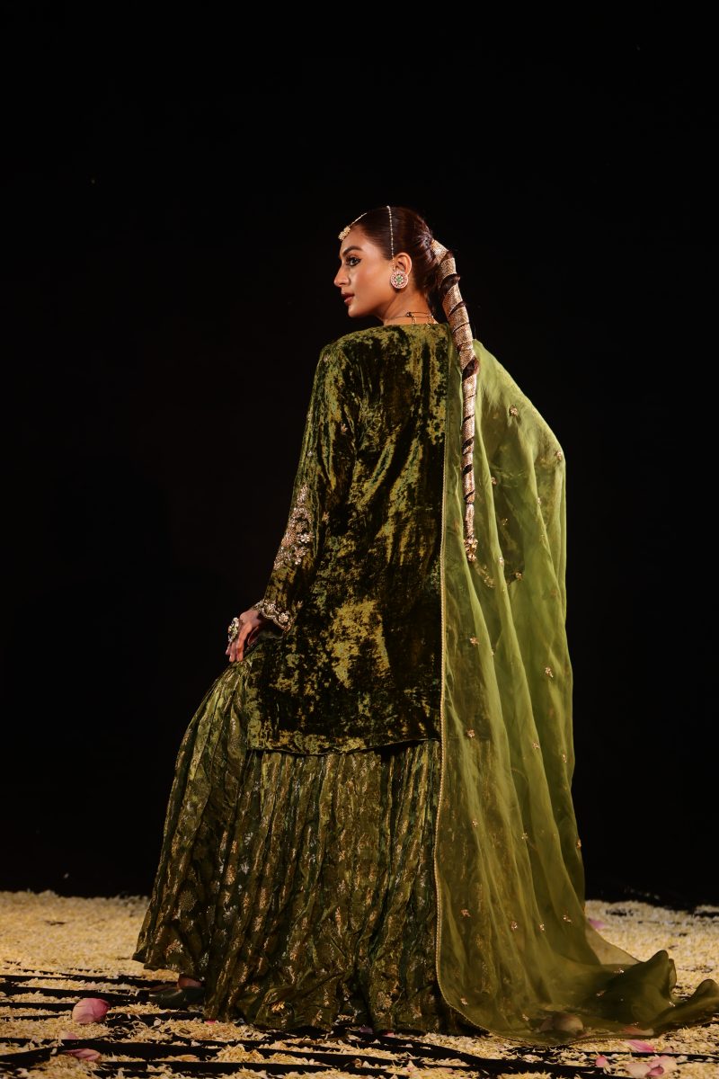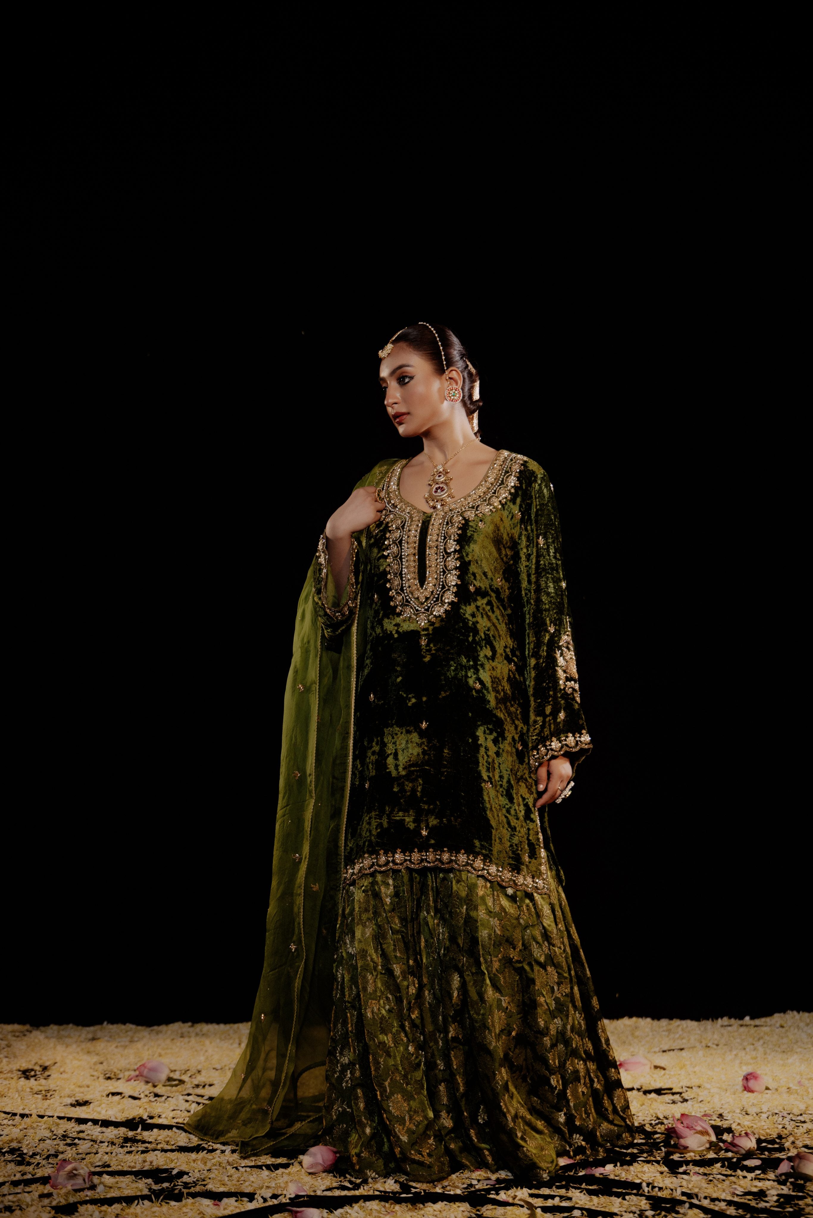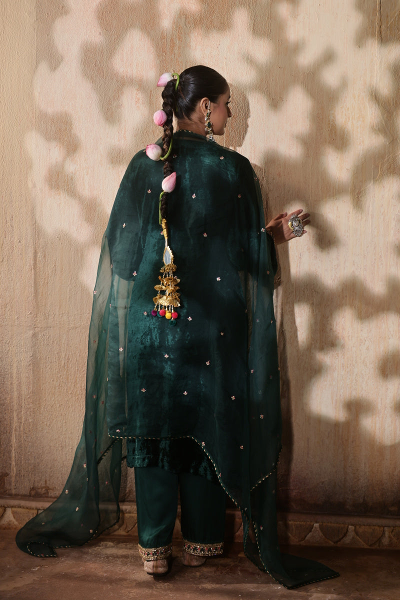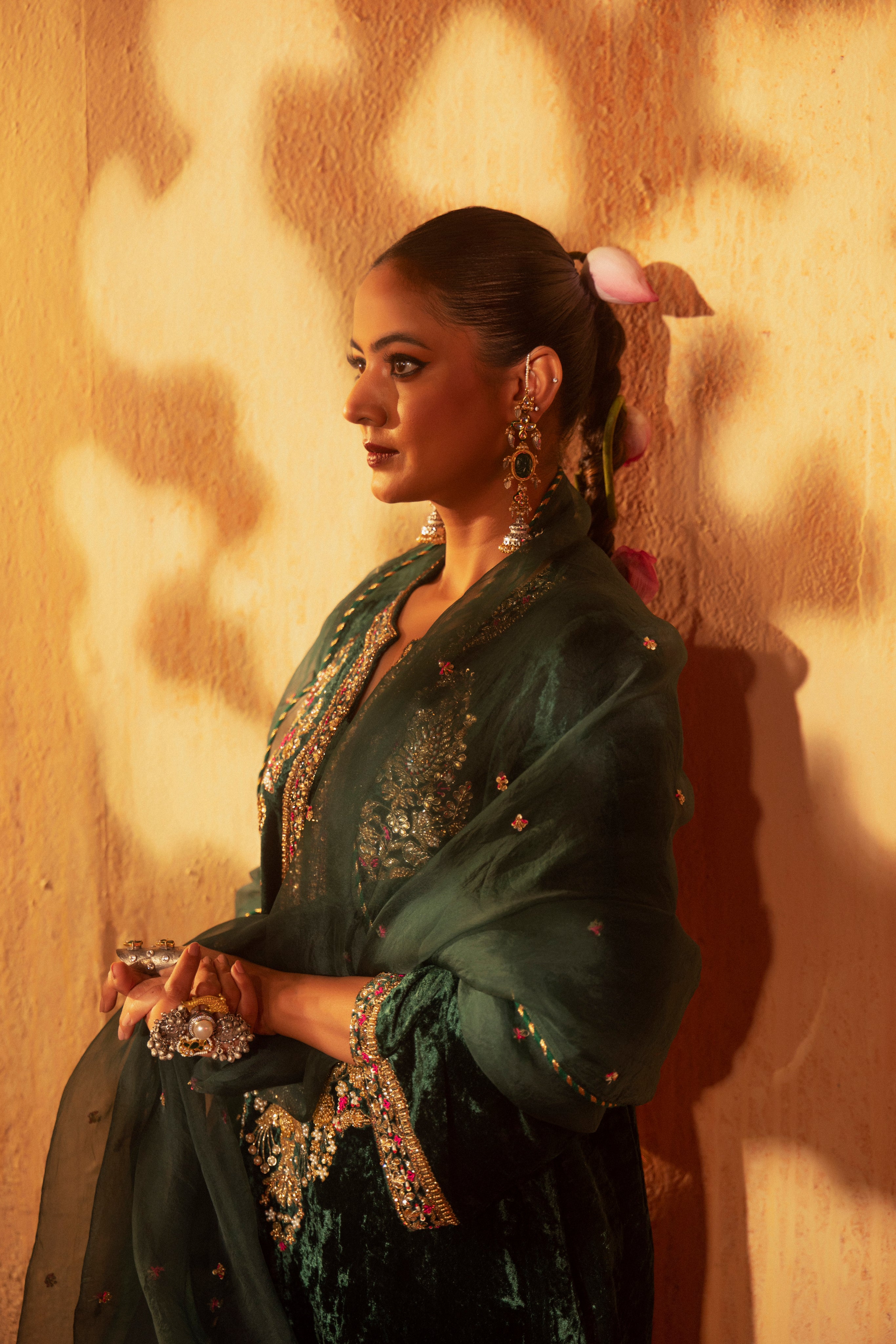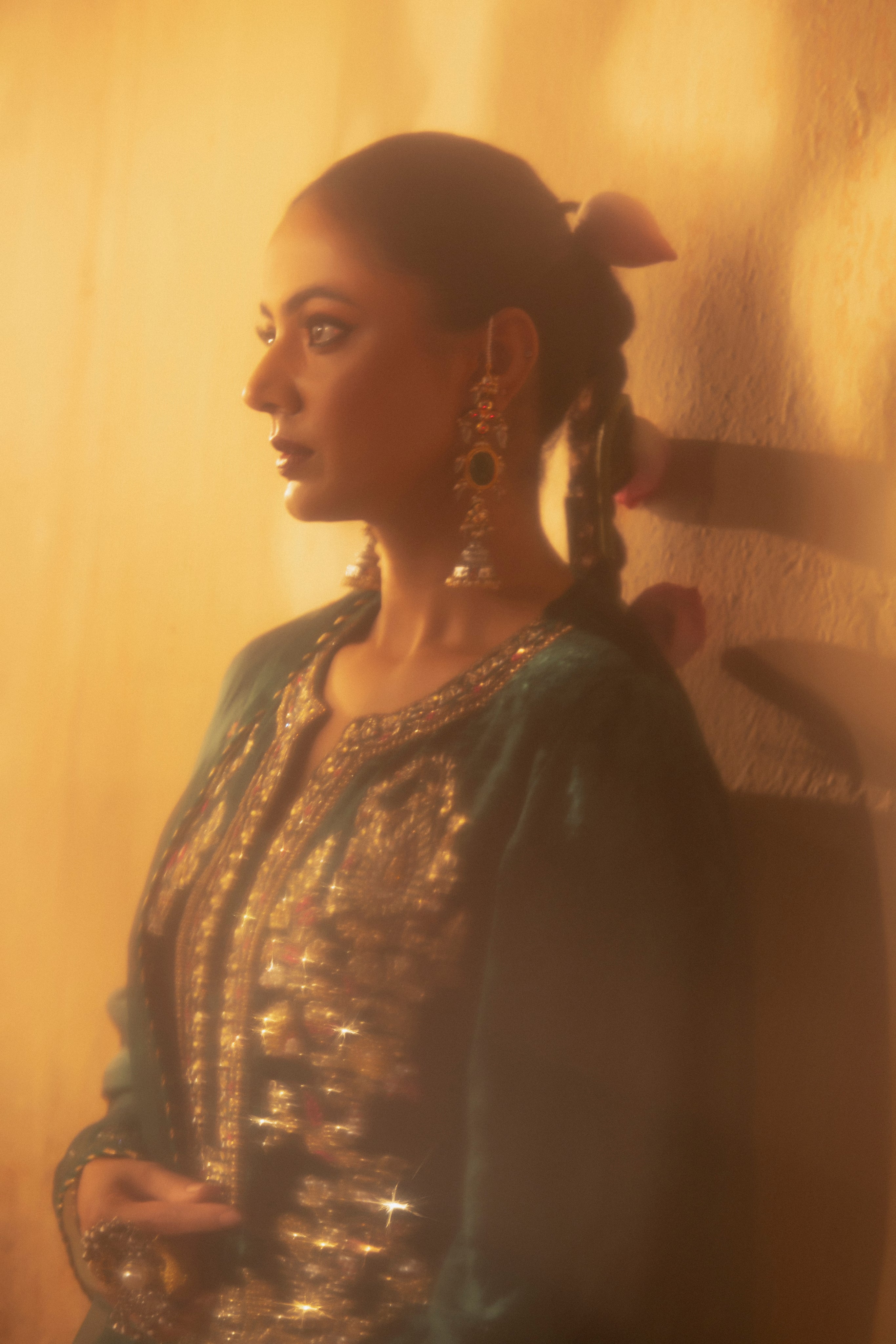 The Bottle Green Velvet Pakistani Suit Set from Gul is simply stunning. The intricate hand embroidery with zardozi, aari and cutdana work is absolutely exquisite and makes it perfect for weddings or other formal events. The velvet fabric is also very luxurious and comfortable to wear.