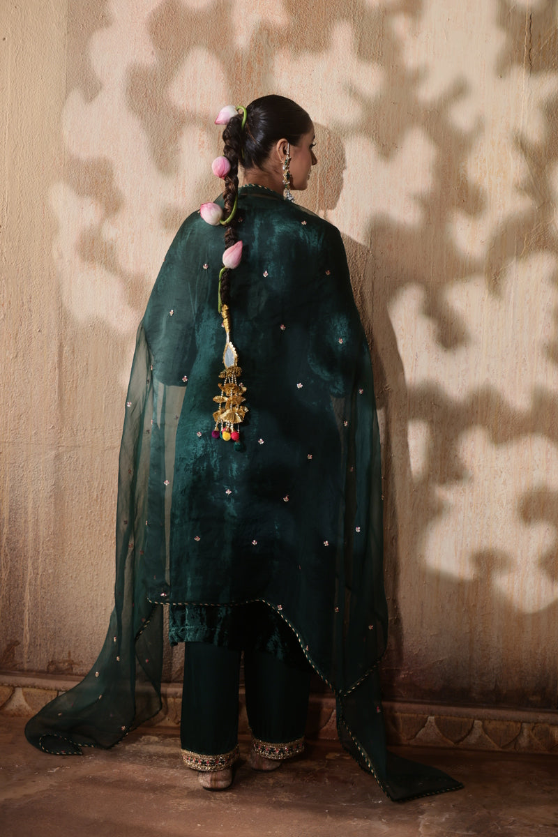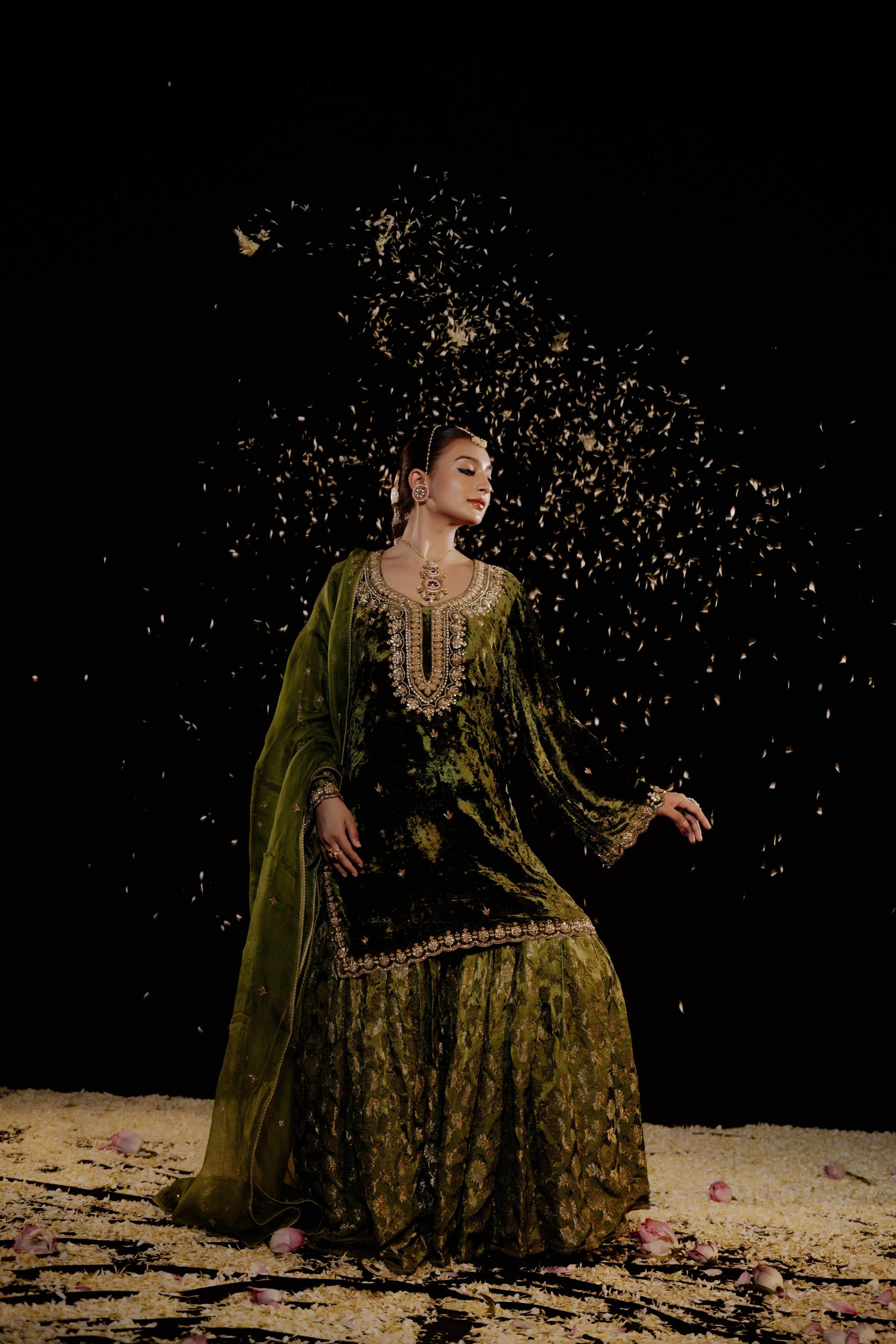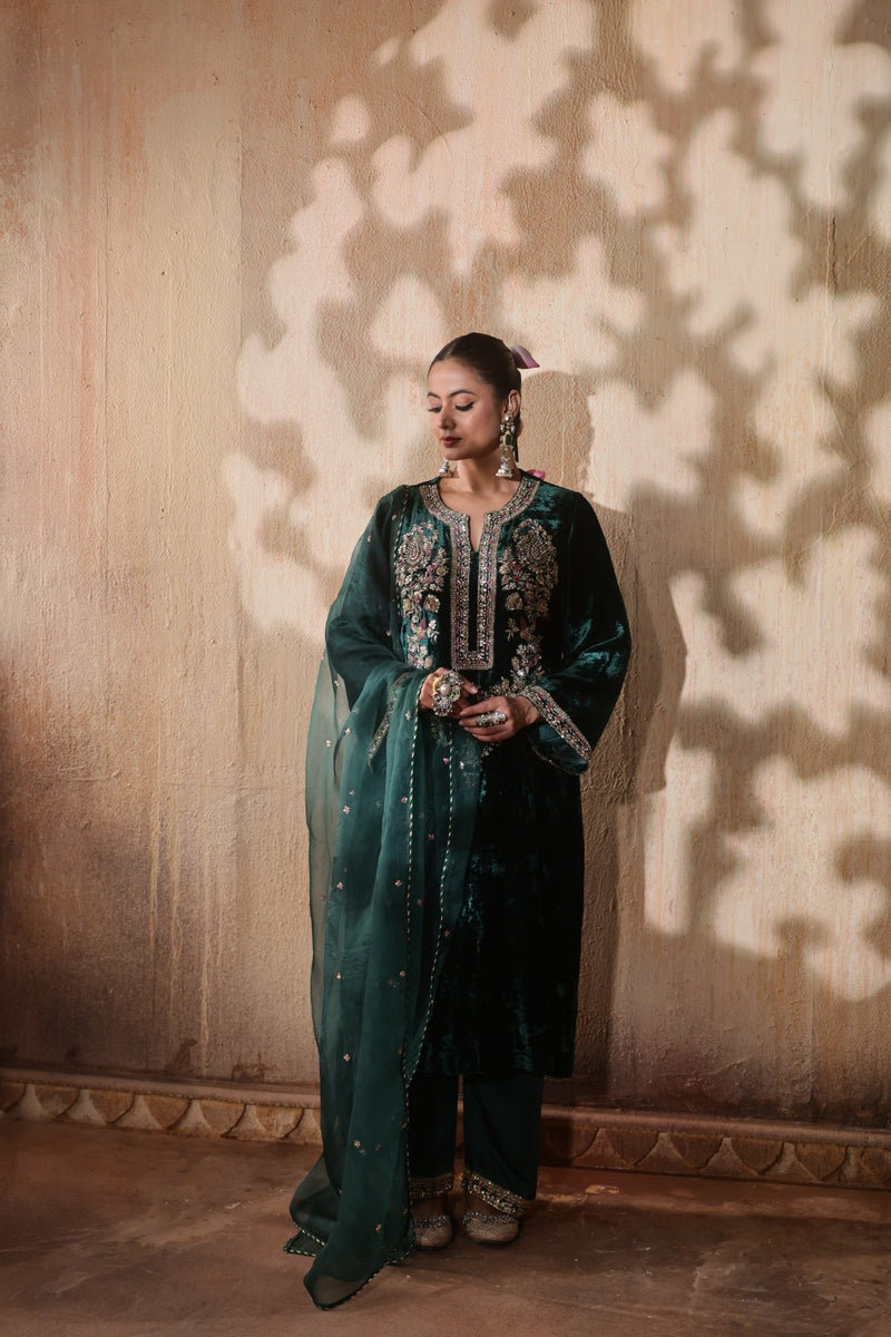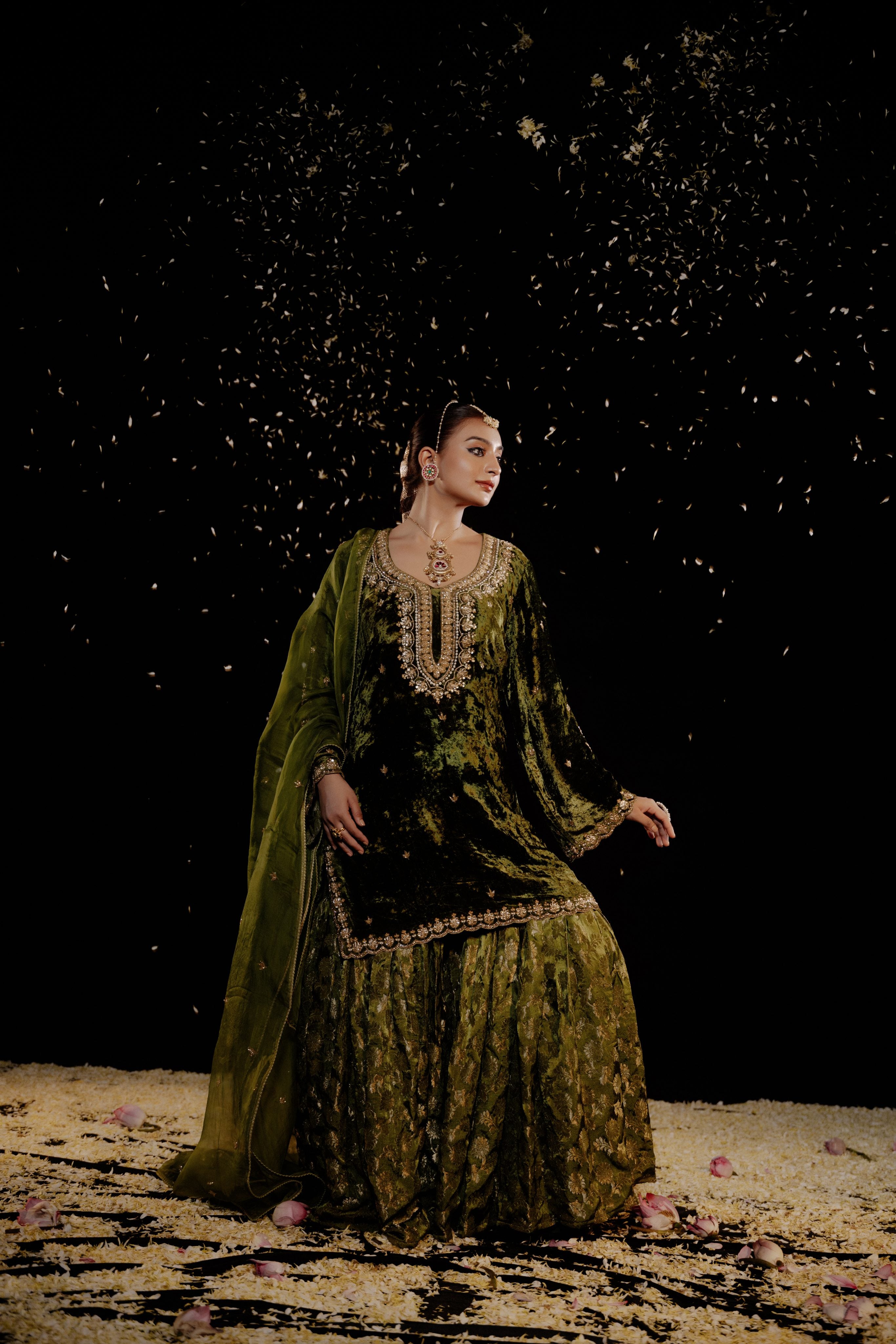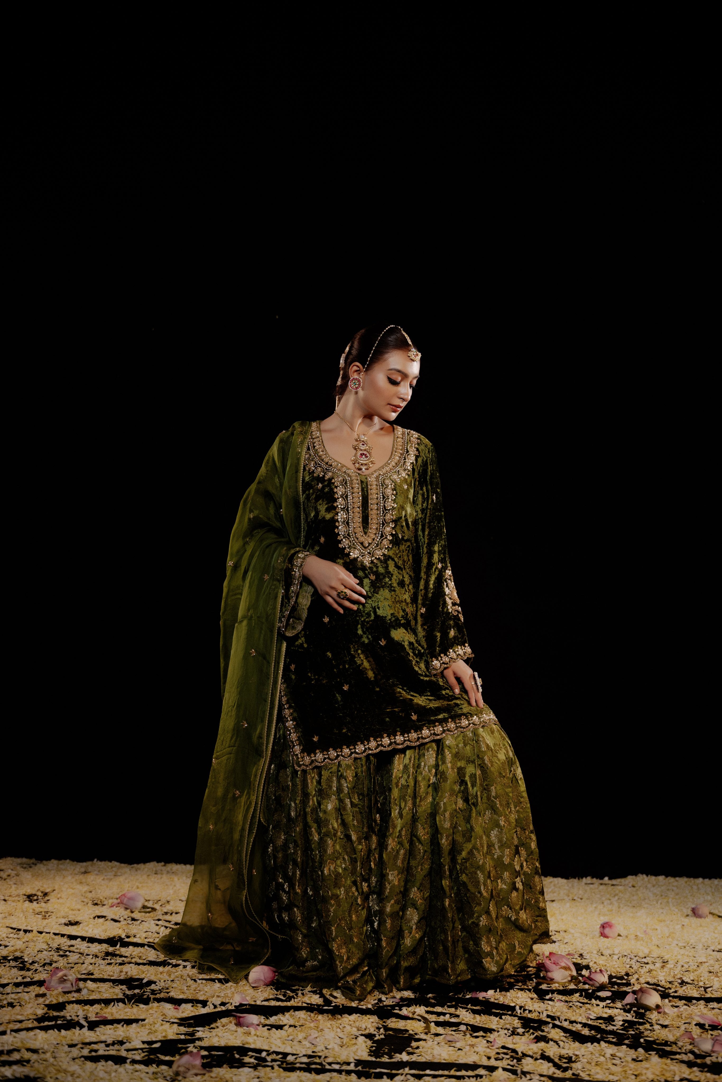 The Bottle Green Velvet Pakistani Suit Set from Gul is simply stunning. The intricate hand embroidery with zardozi, aari and cutdana work is absolutely exquisite and makes it perfect for weddings or other formal events. The velvet fabric is also very luxurious and comfortable to wear.