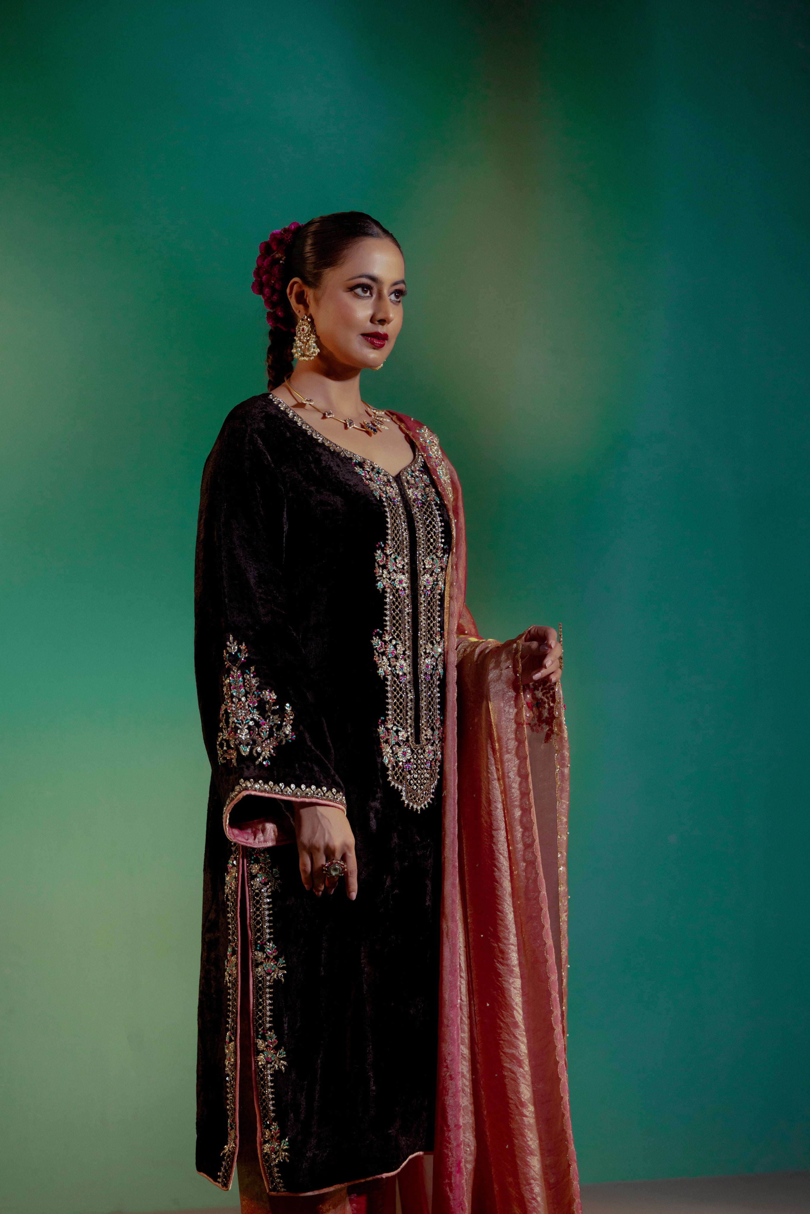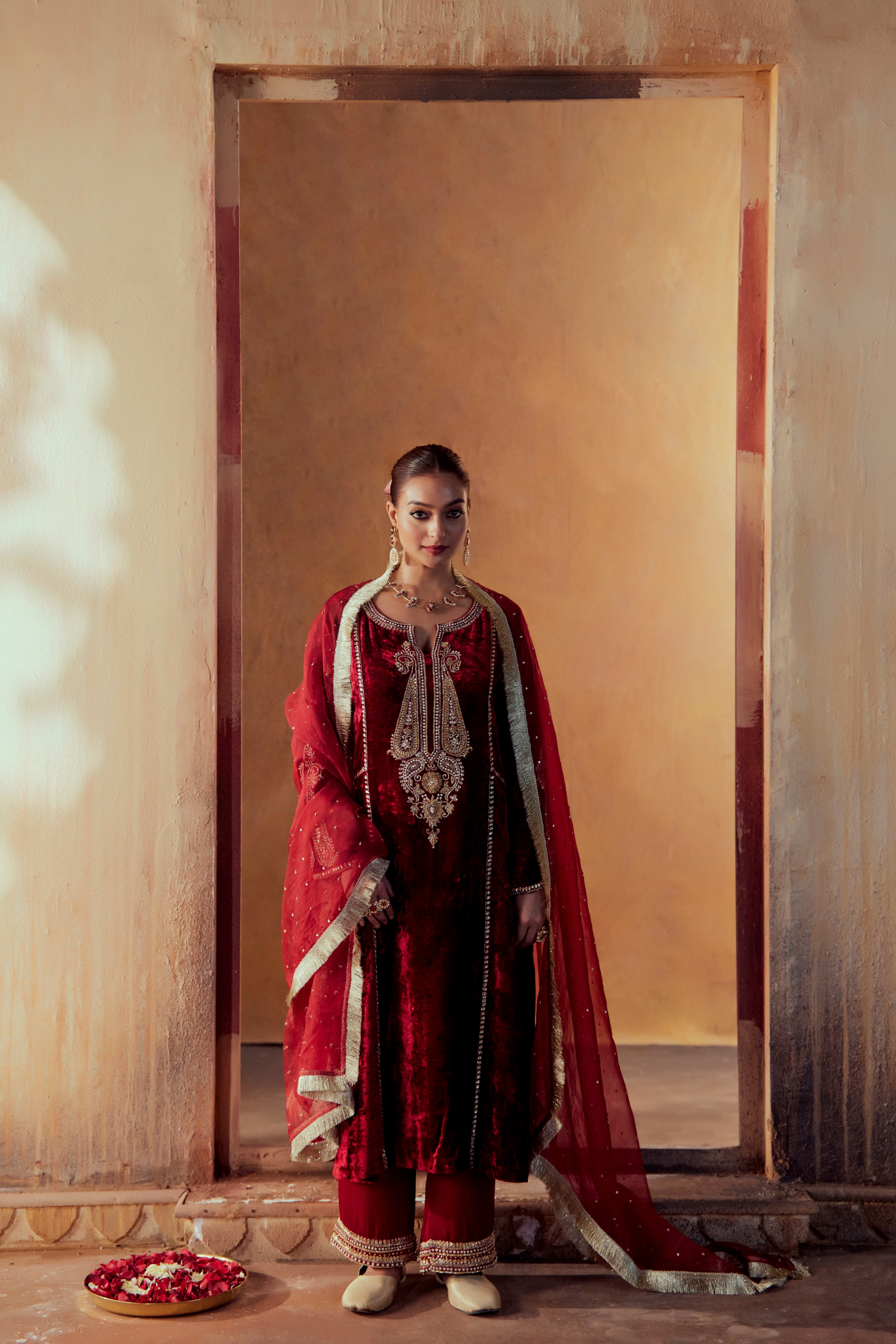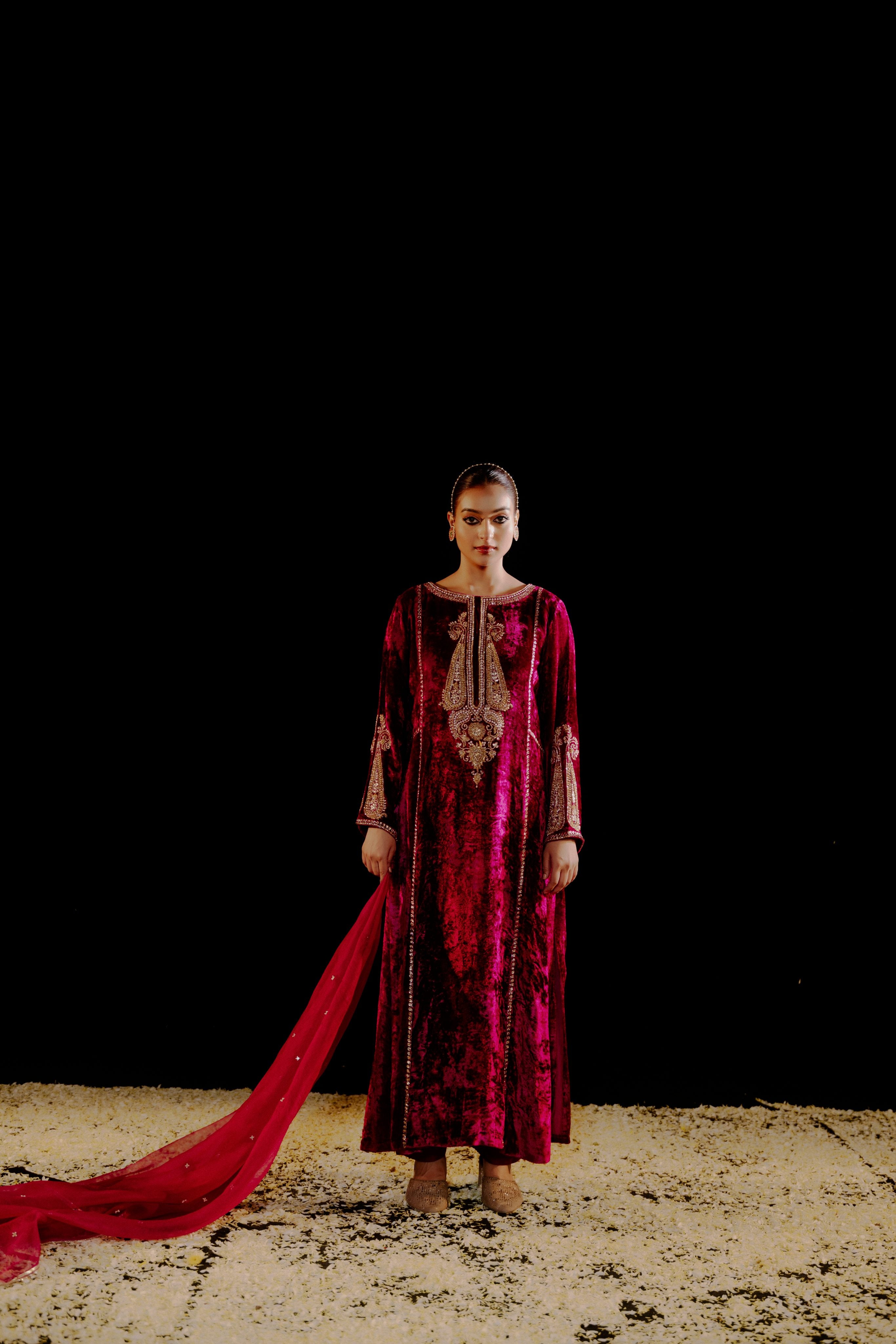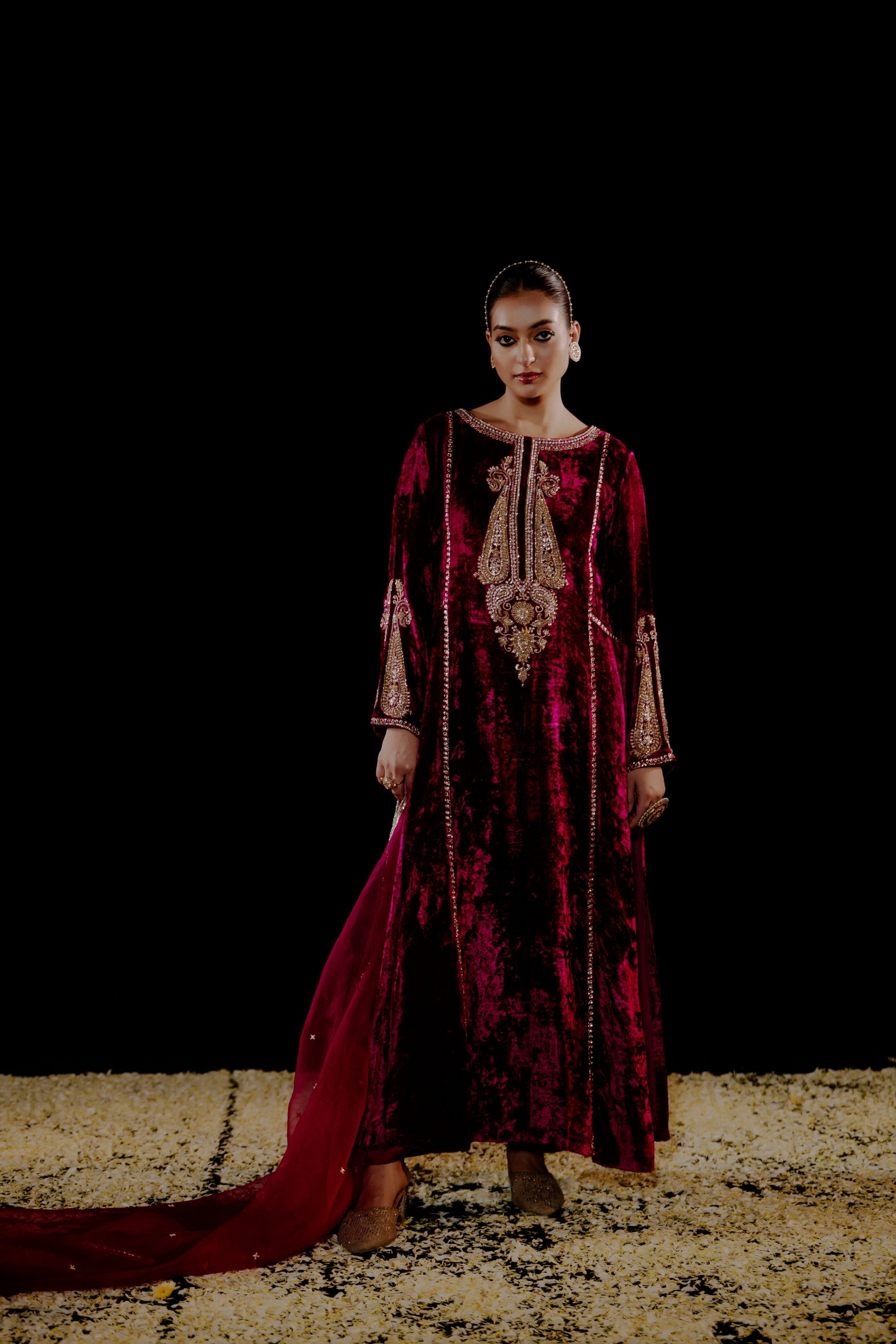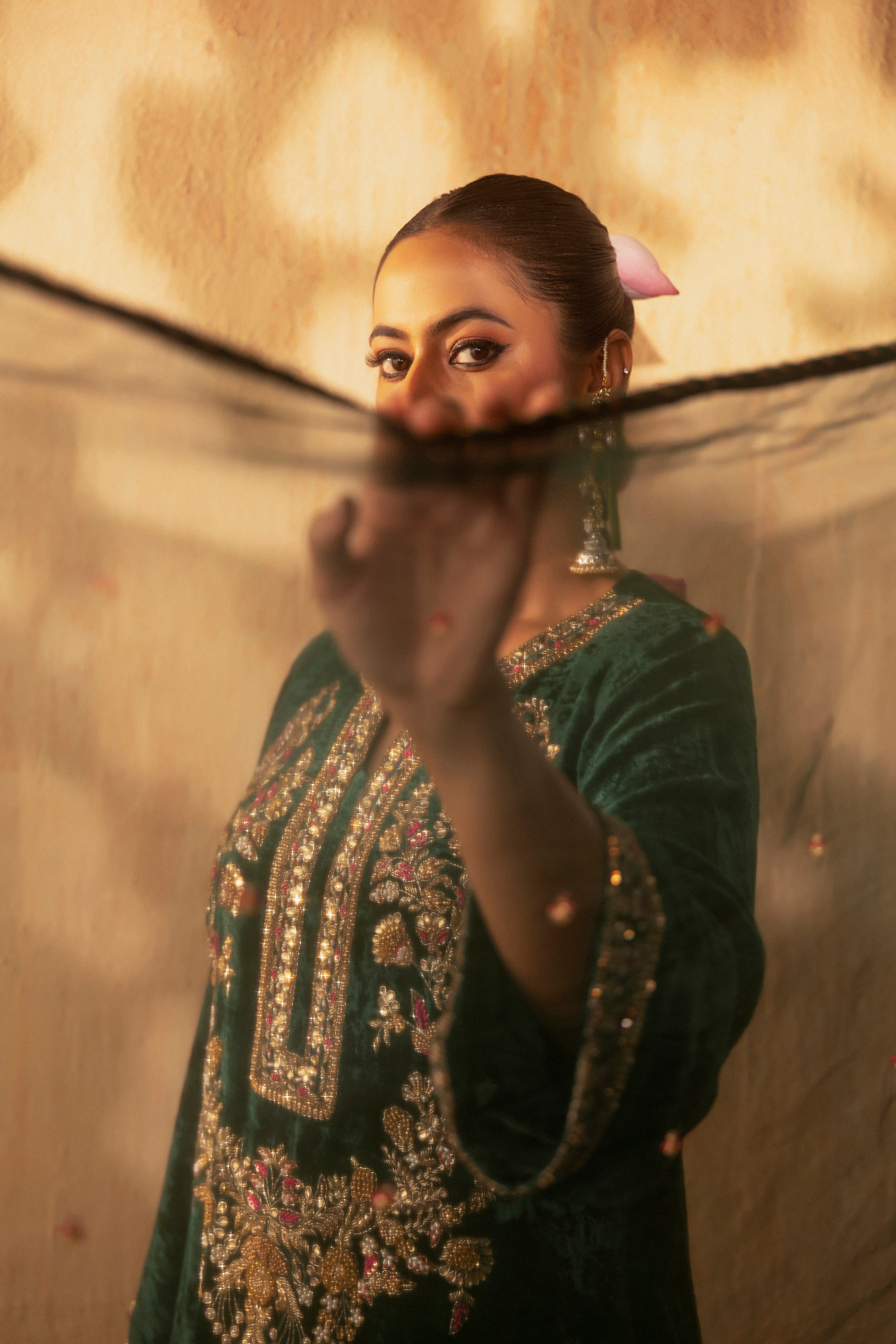 The Bottle Green Velvet Pakistani Suit Set from Gul is simply stunning. The intricate hand embroidery with zardozi, aari and cutdana work is absolutely exquisite and makes it perfect for weddings or other formal events. The velvet fabric is also very luxurious and comfortable to wear.