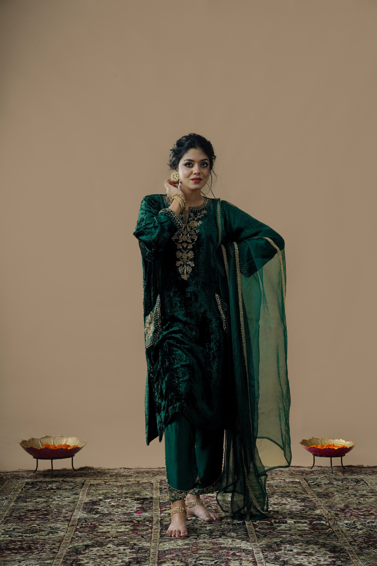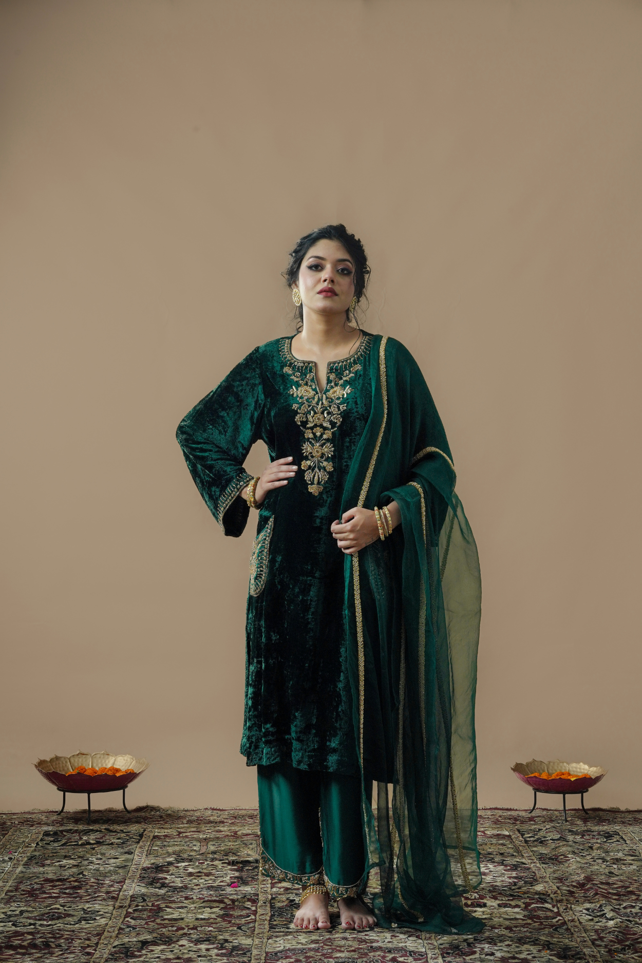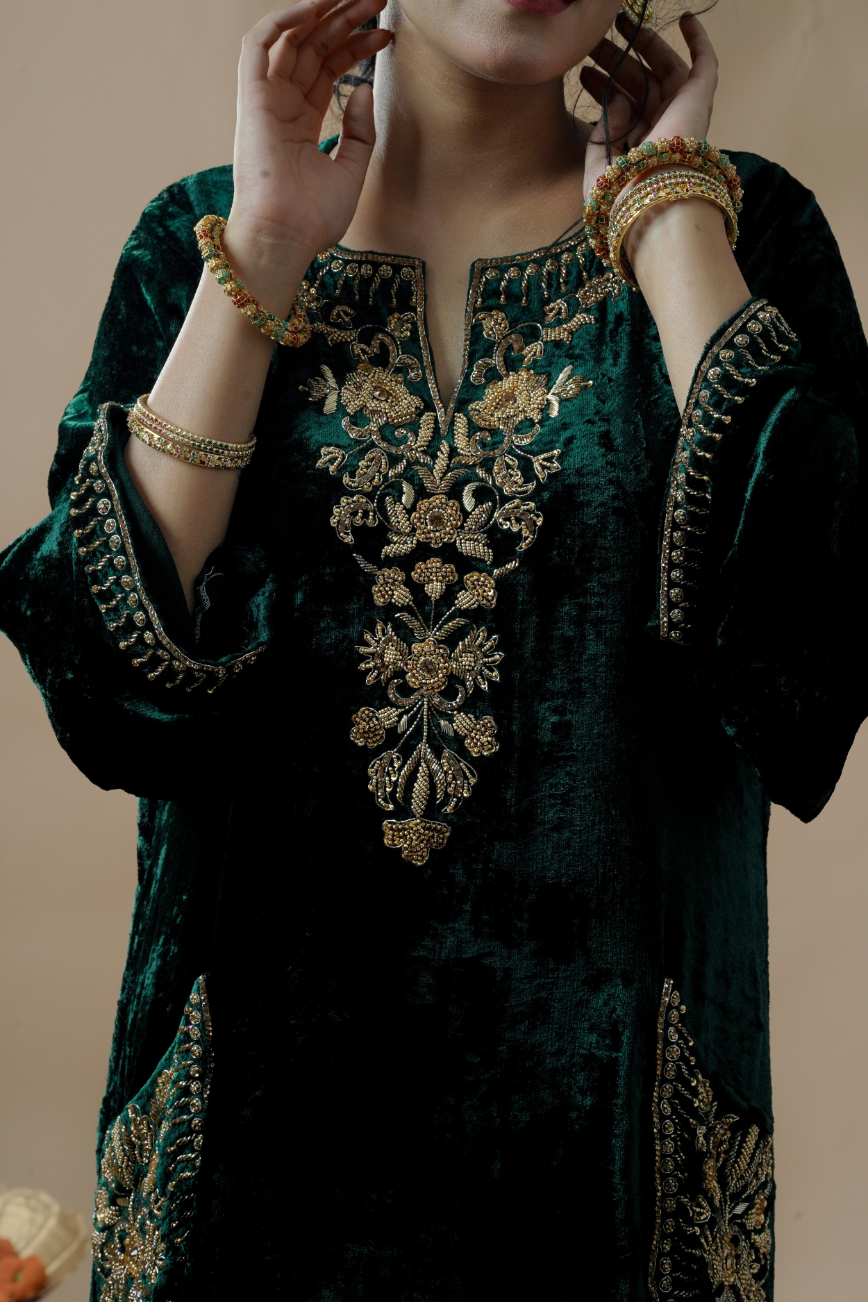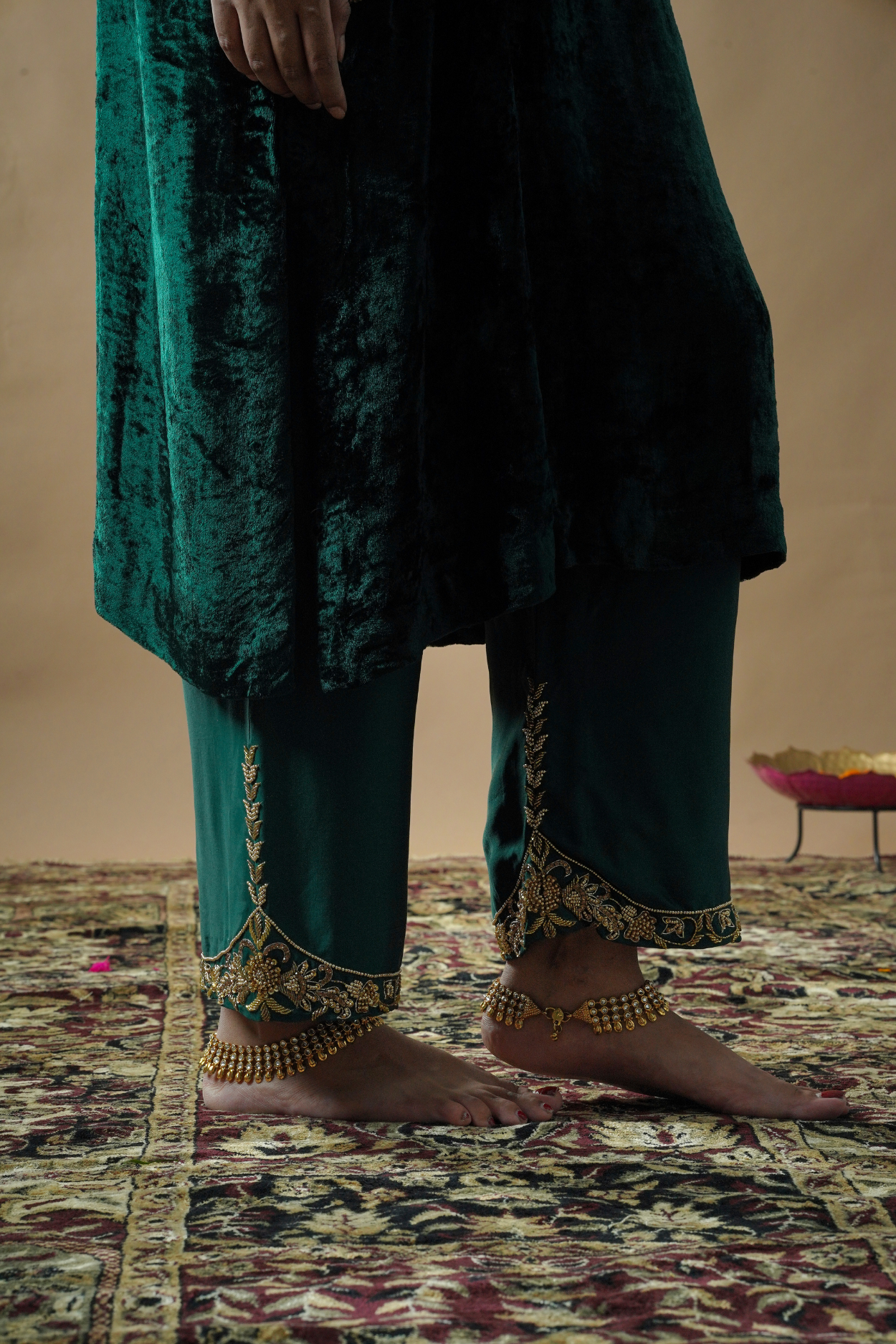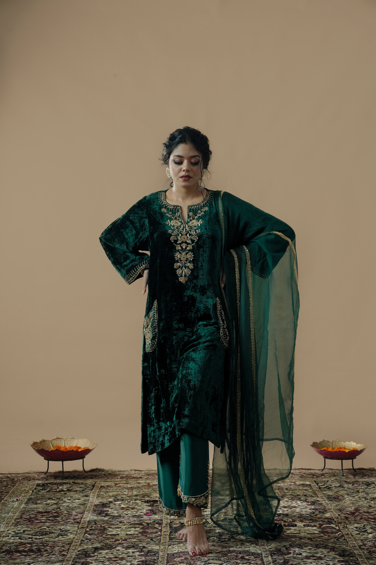 BOTTLE GREEN GARLAND NECKLINE KURTA SET