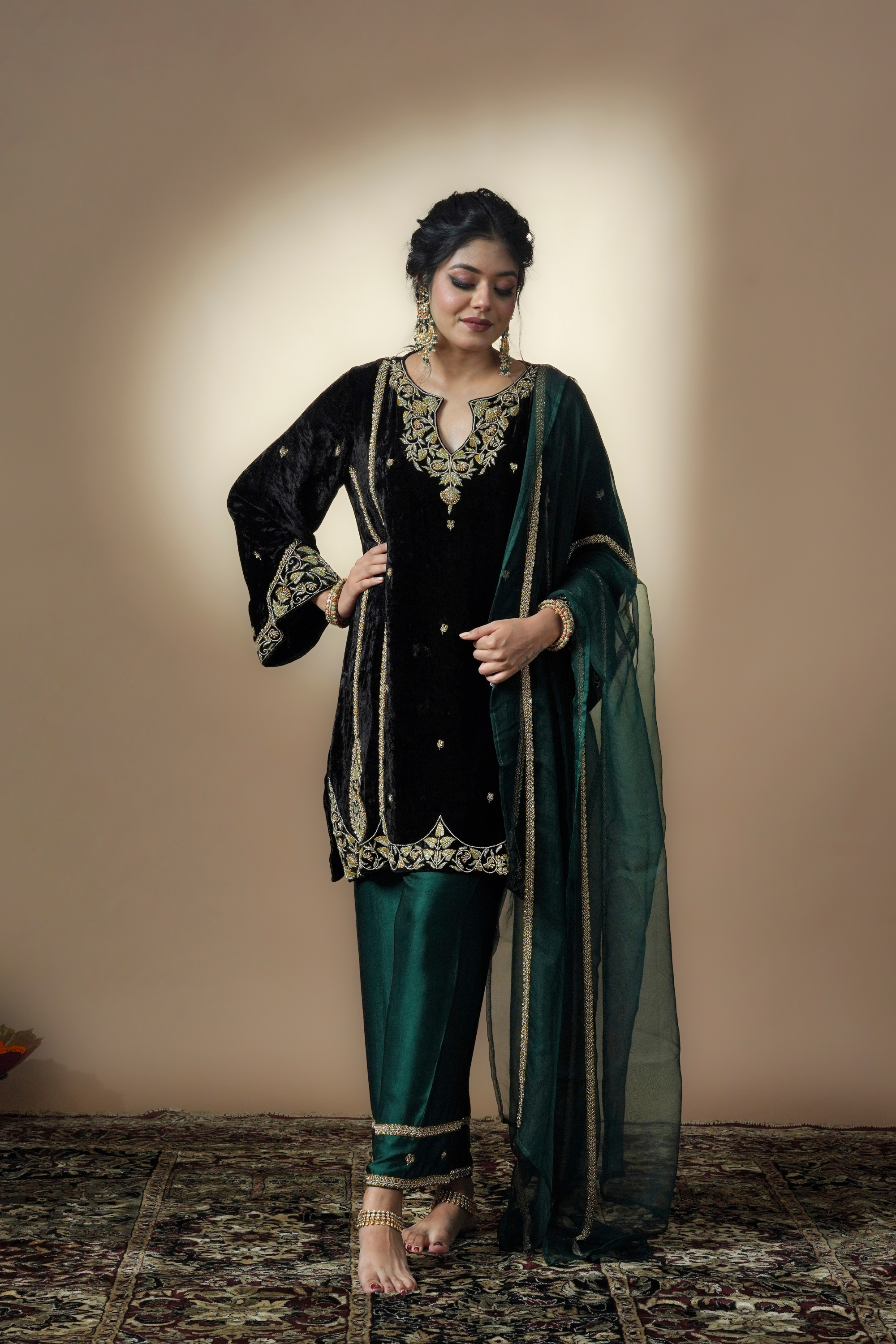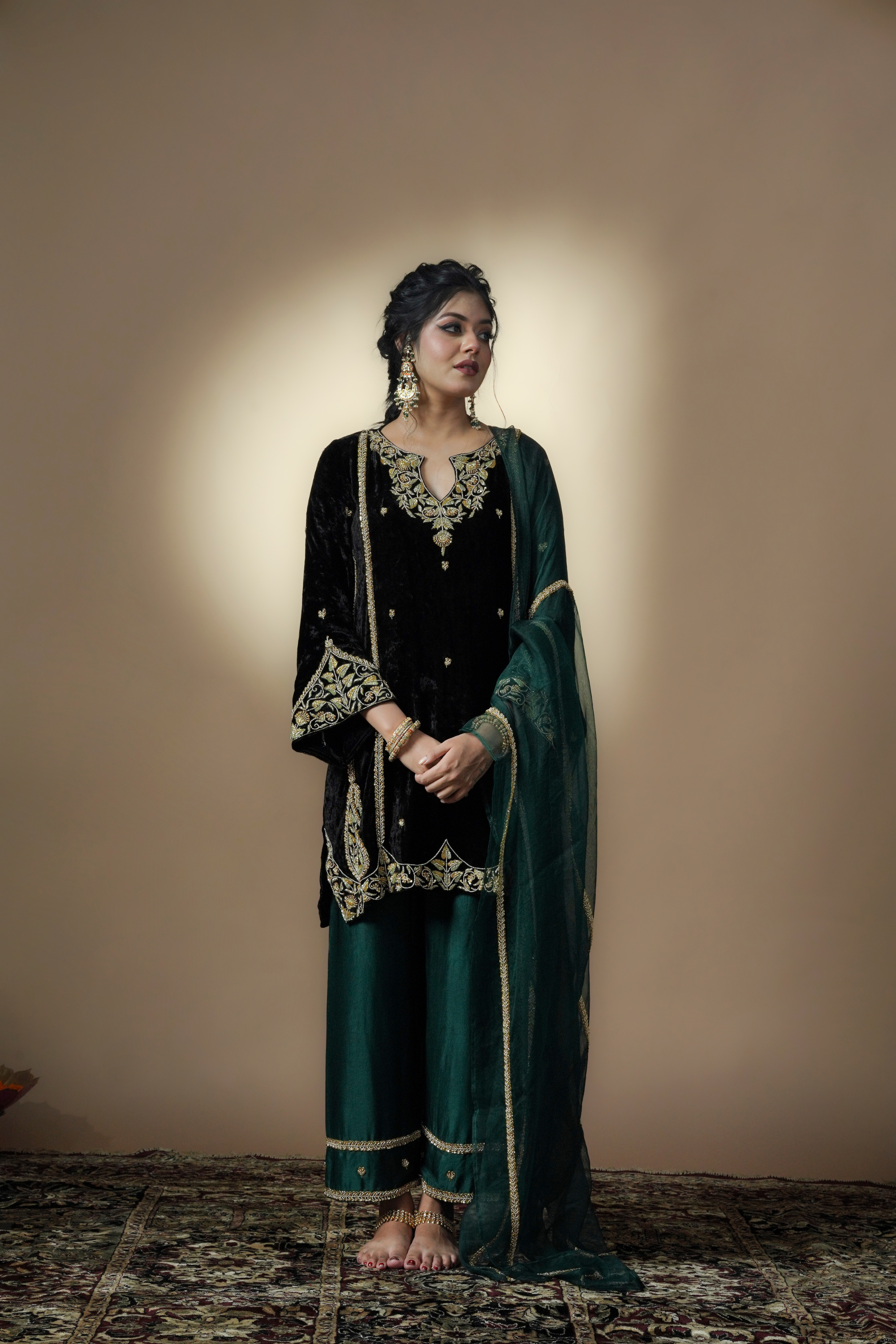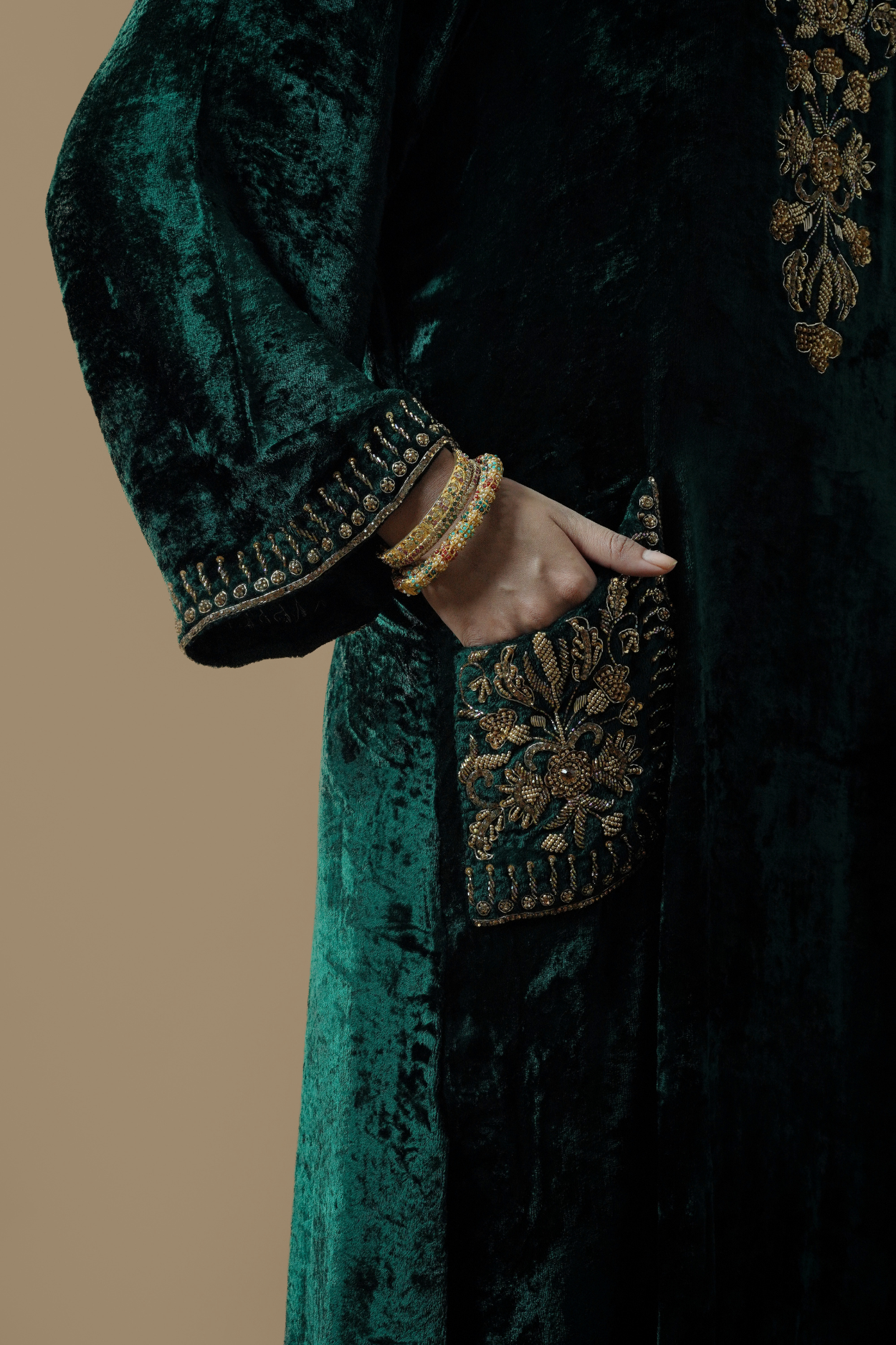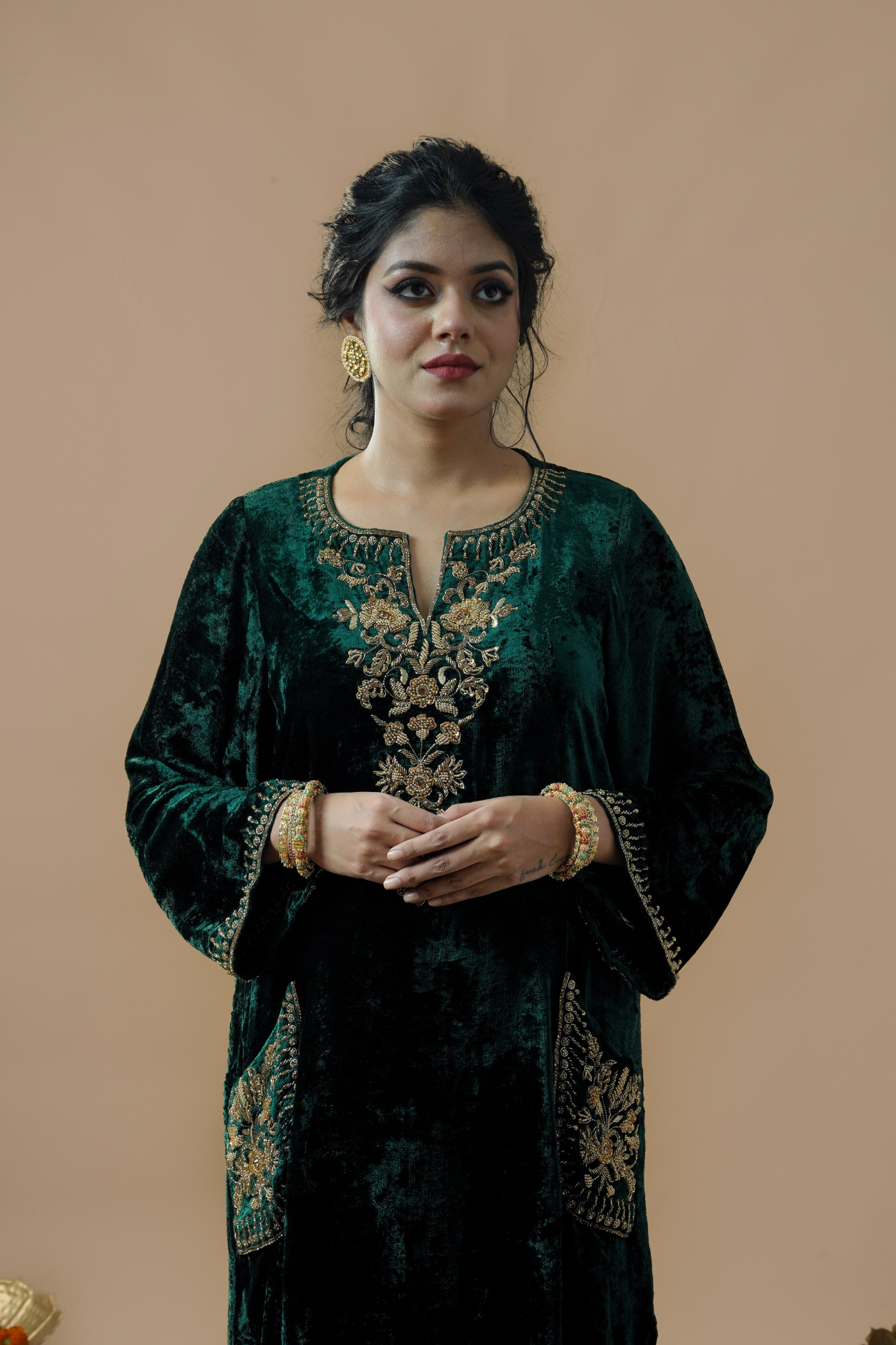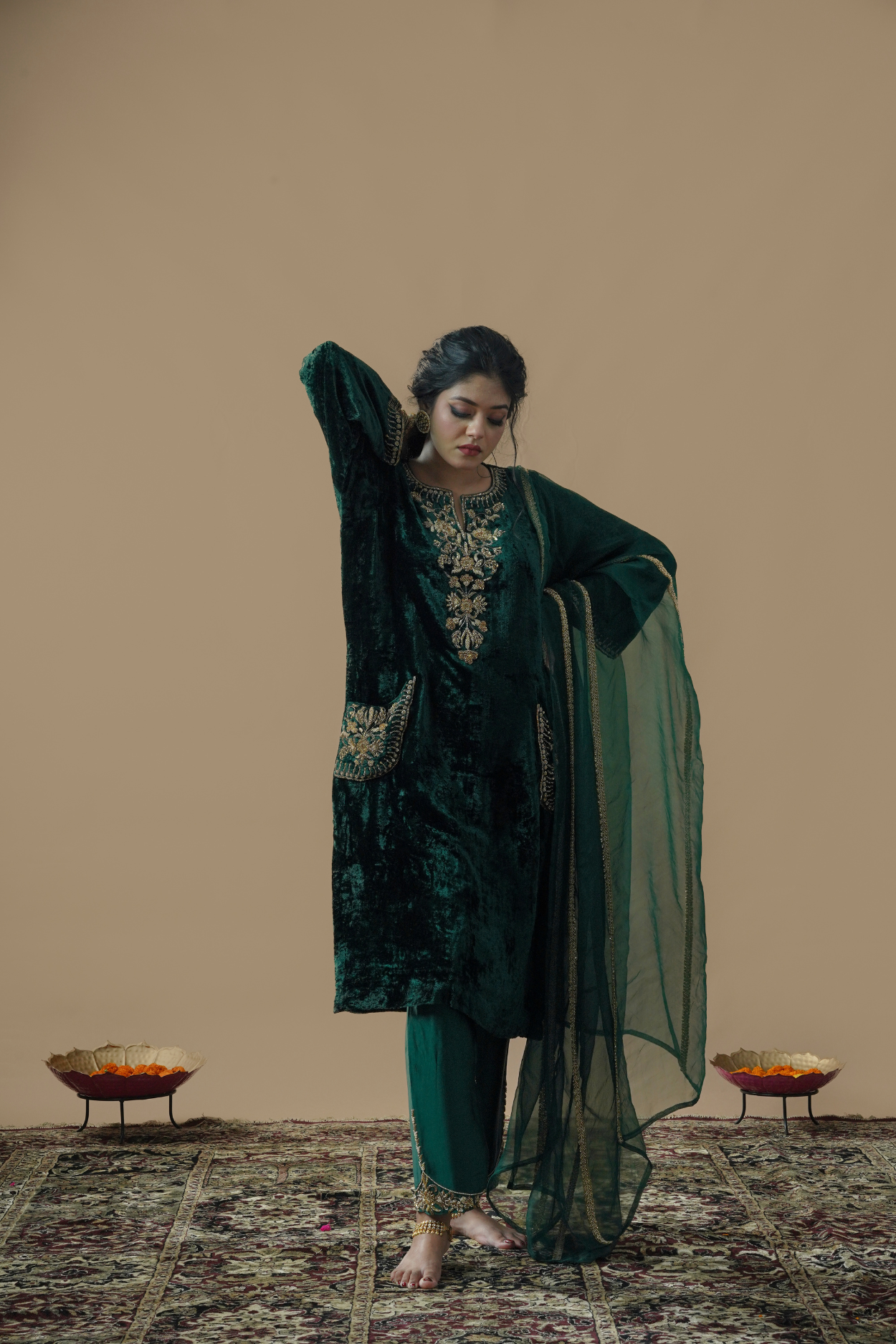 BOTTLE GREEN GARLAND NECKLINE KURTA SET