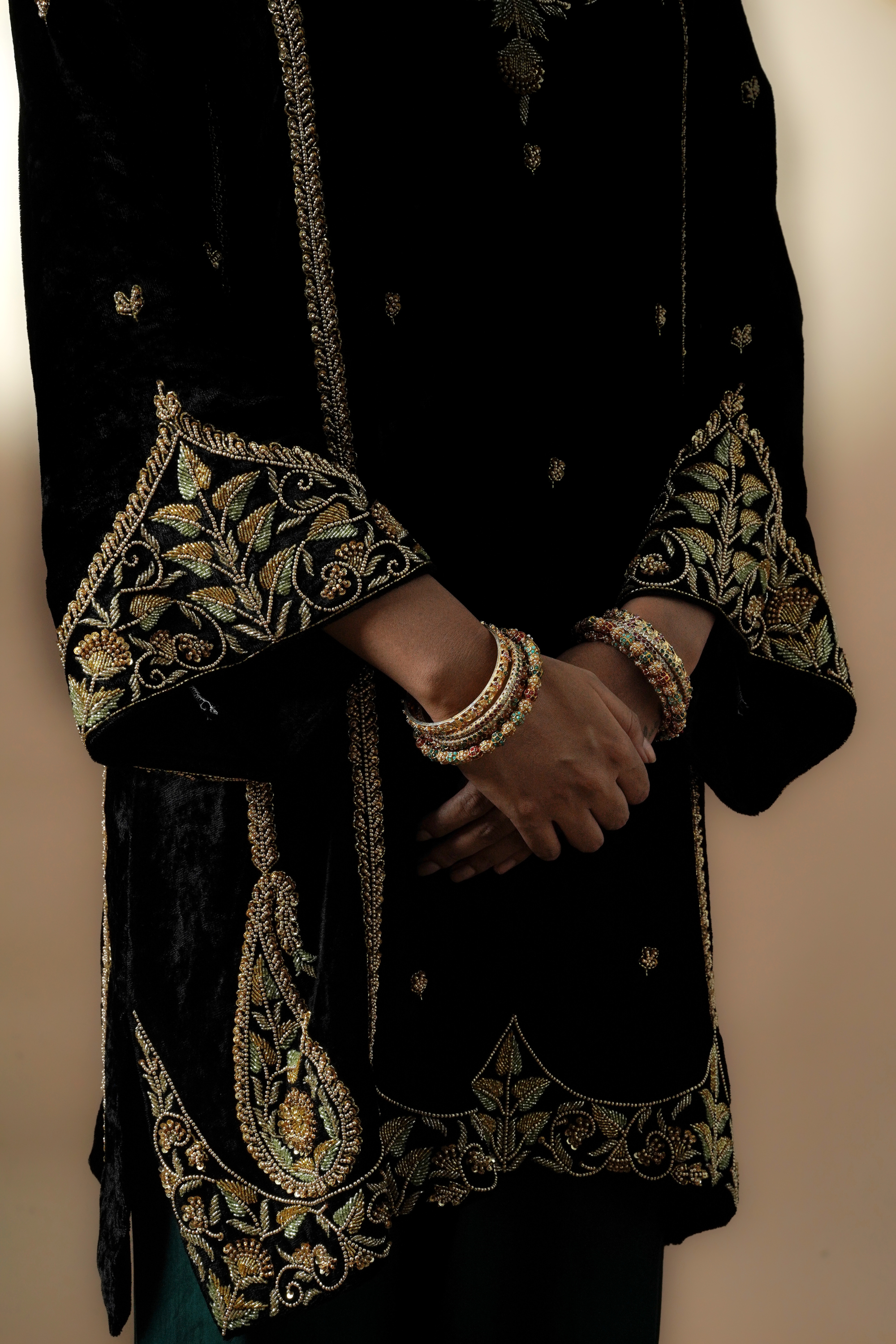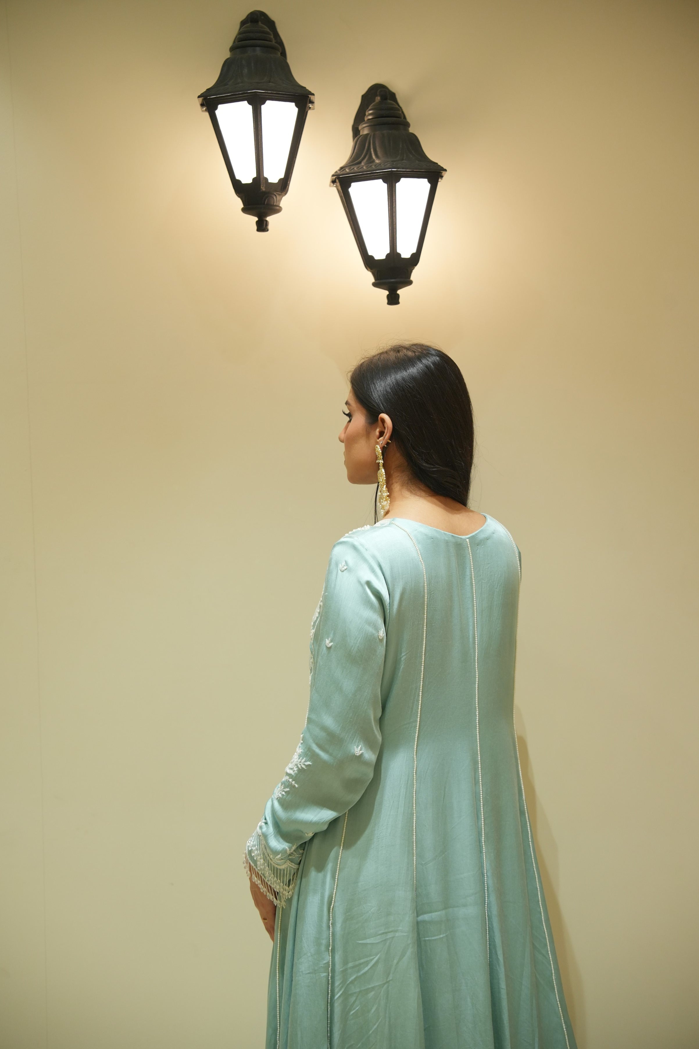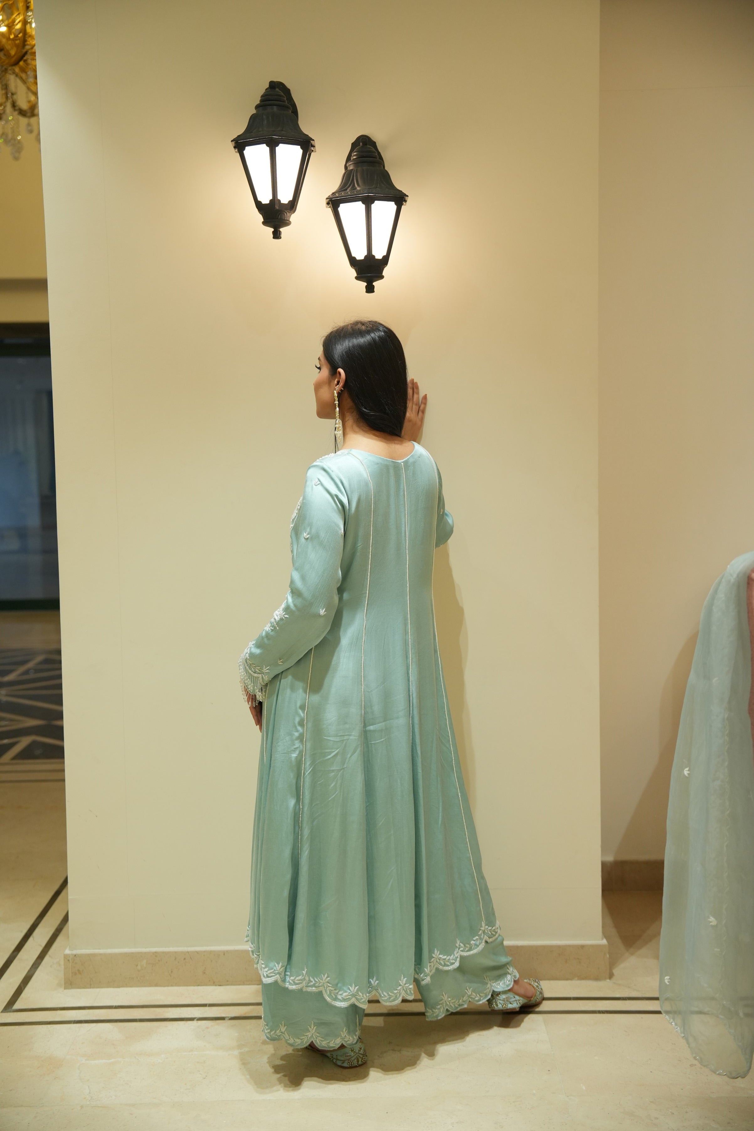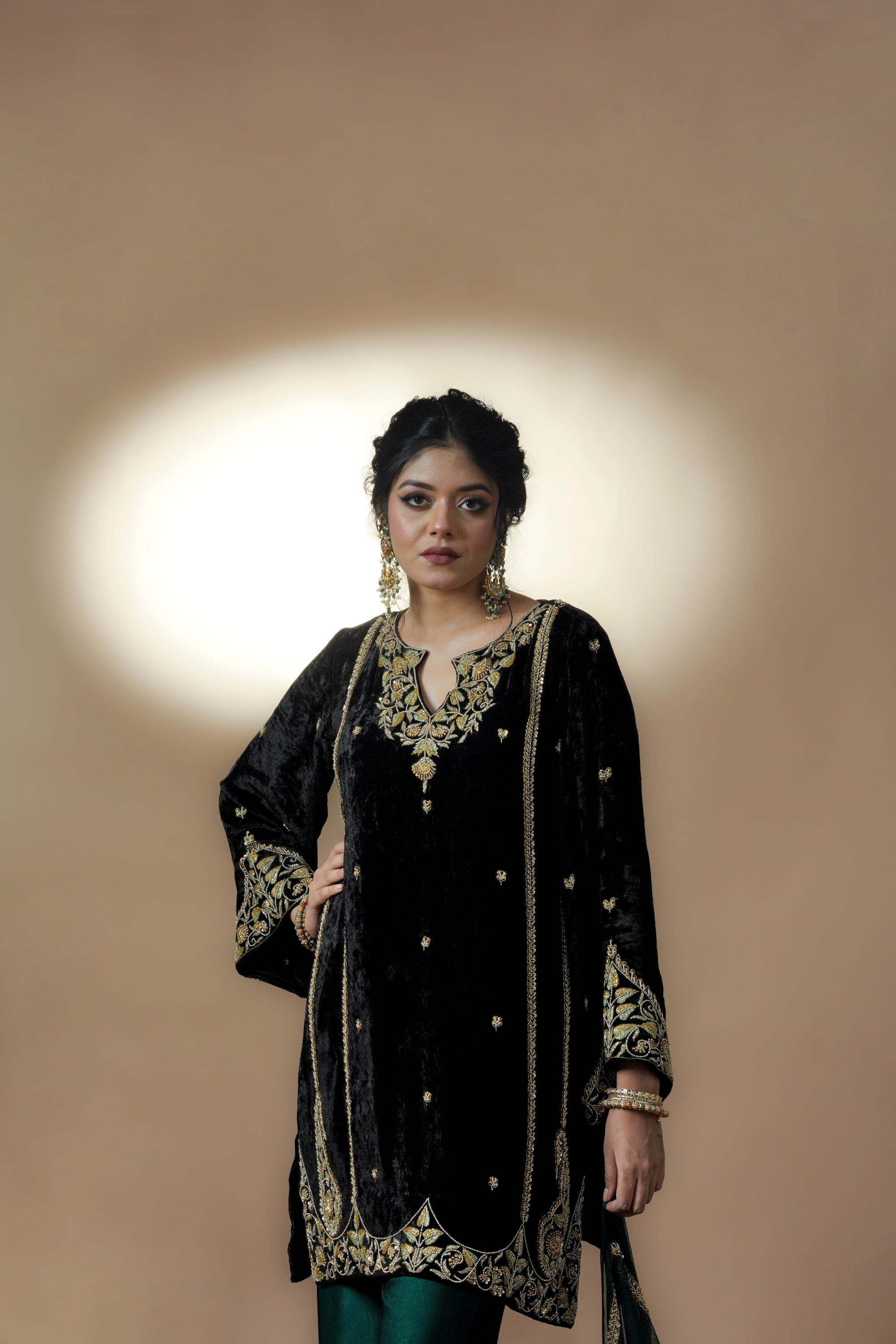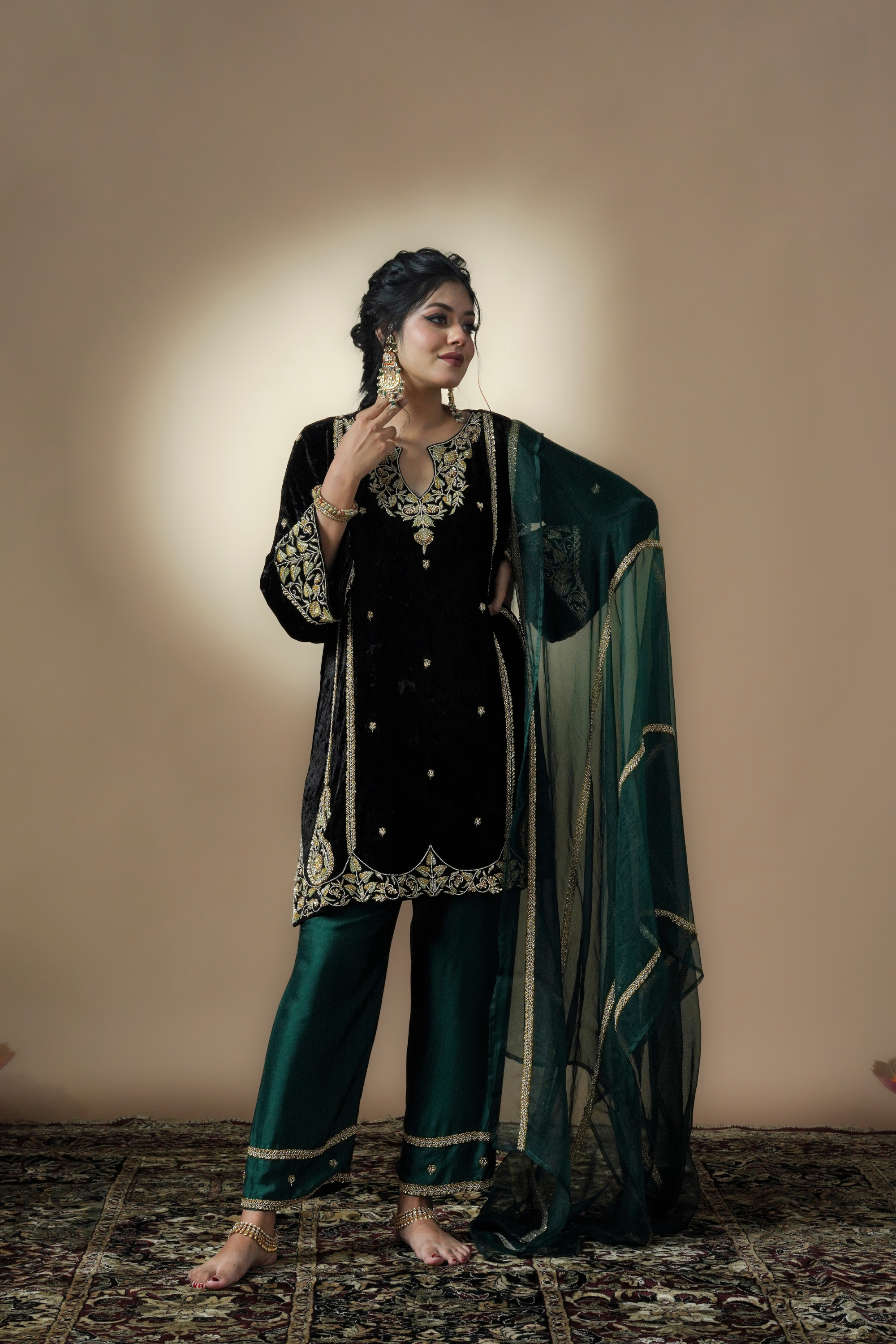 BOTTLE GREEN GARLAND NECKLINE KURTA SET