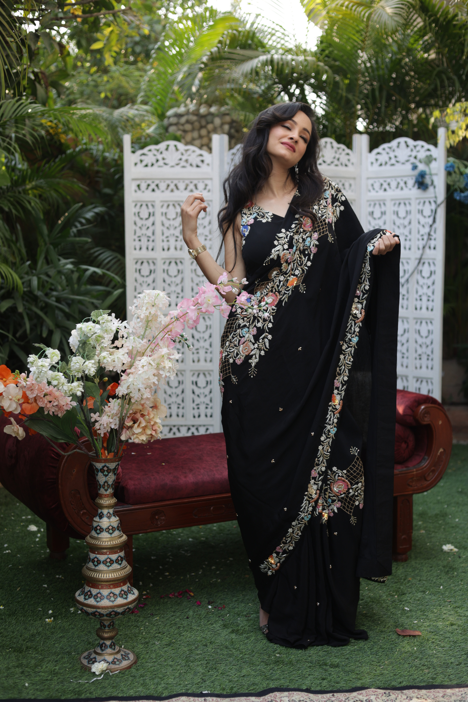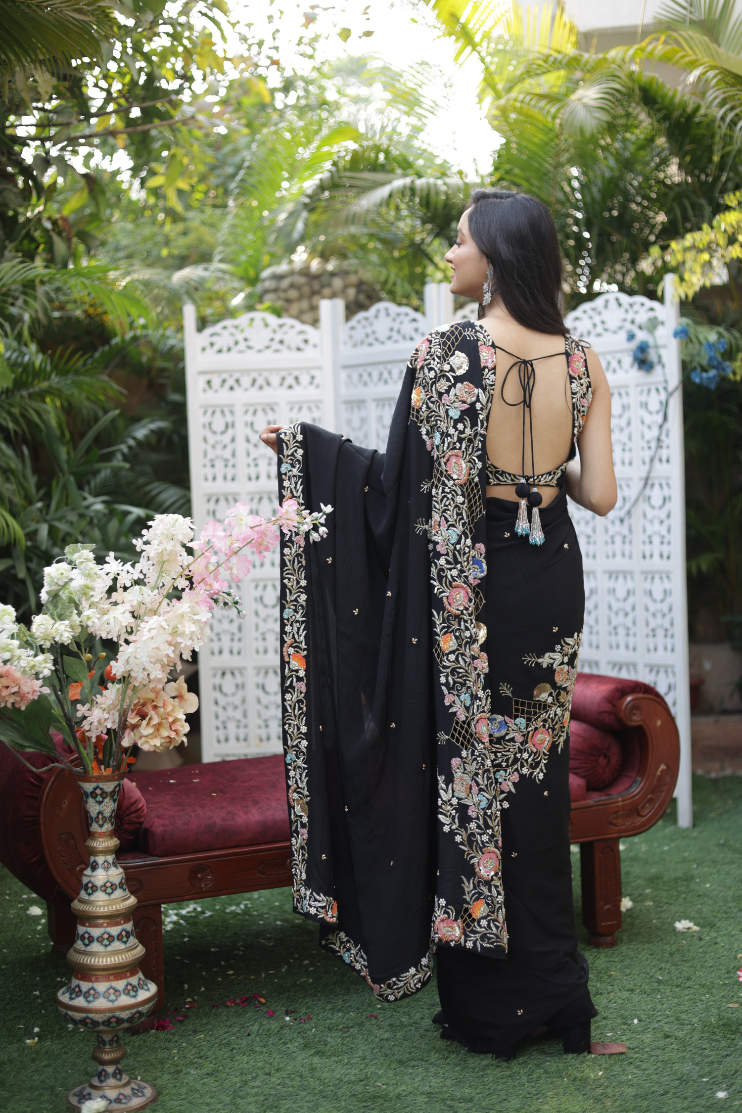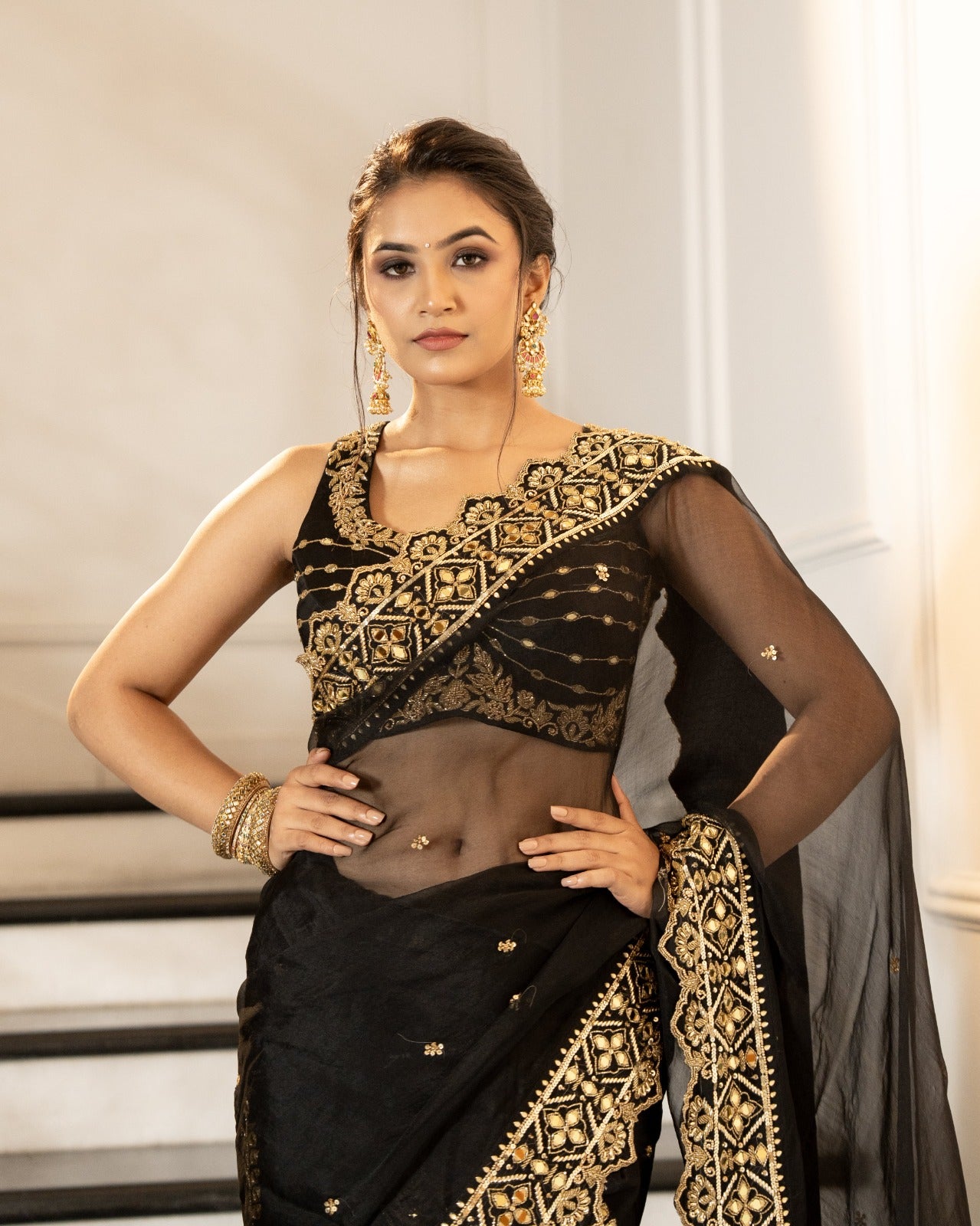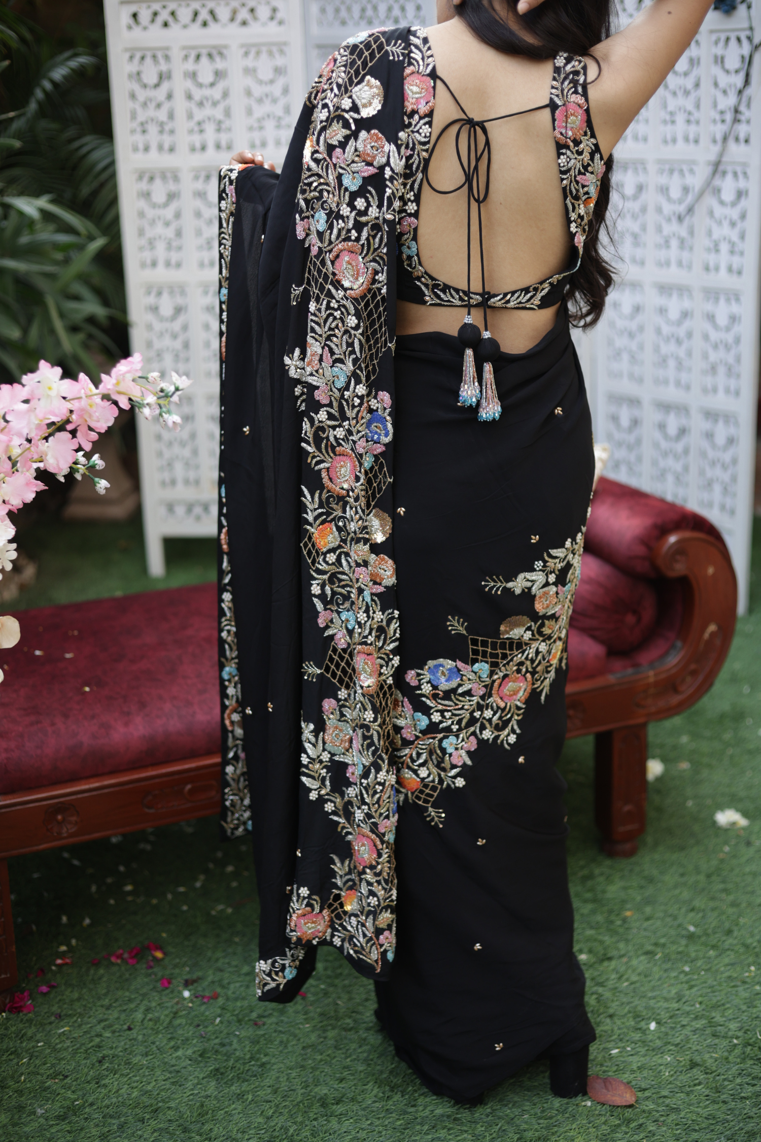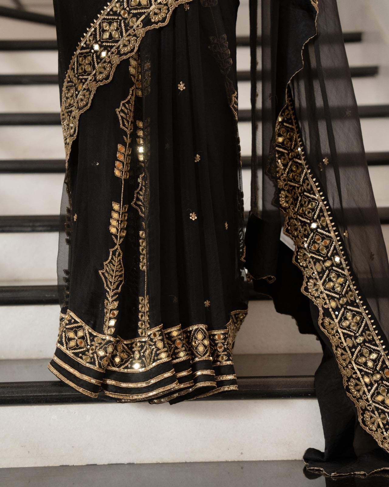 Black rajasthani embroidered mirrorwork saree and blouse set