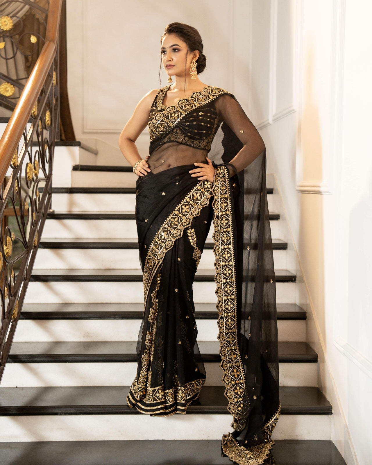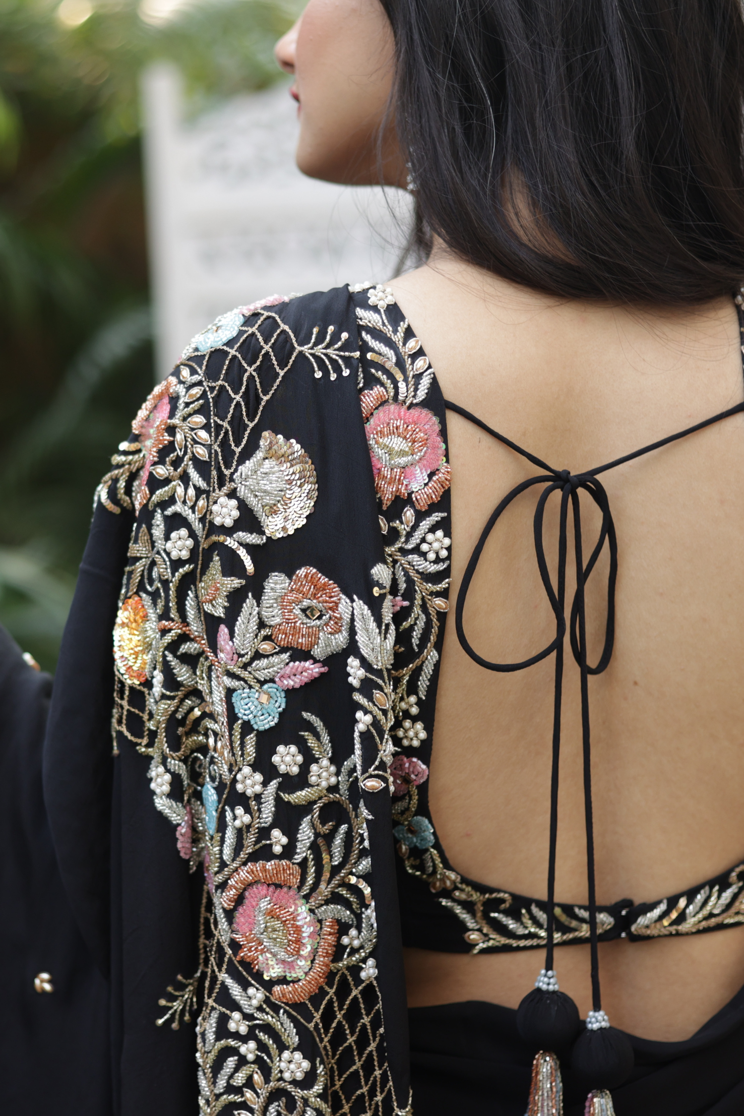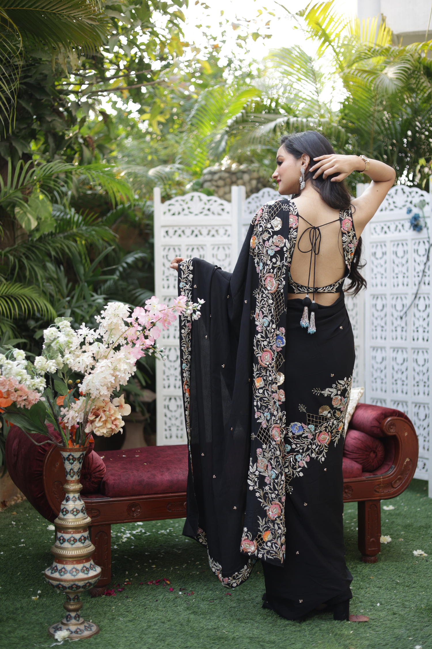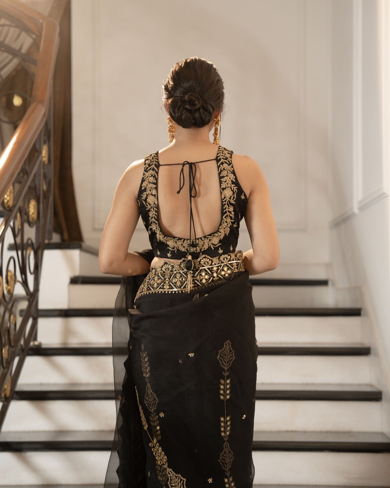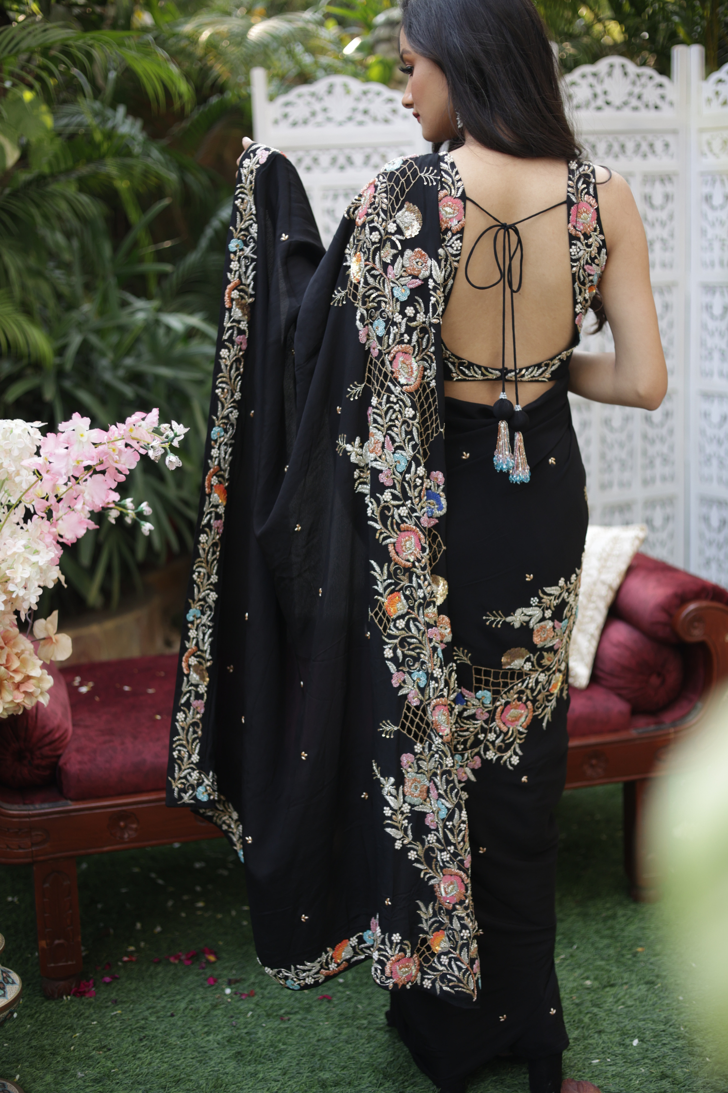 Black rajasthani embroidered mirrorwork saree and blouse set