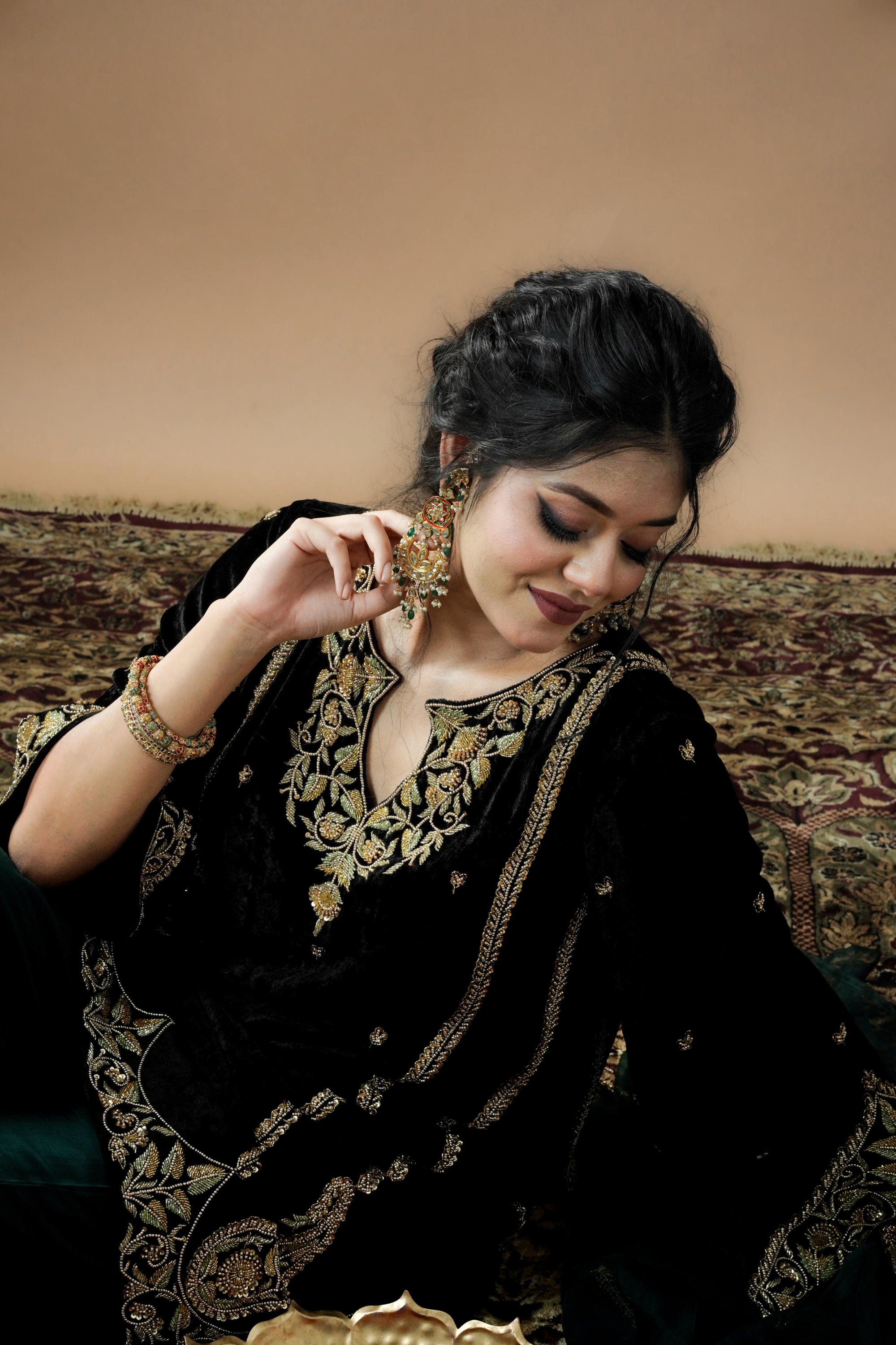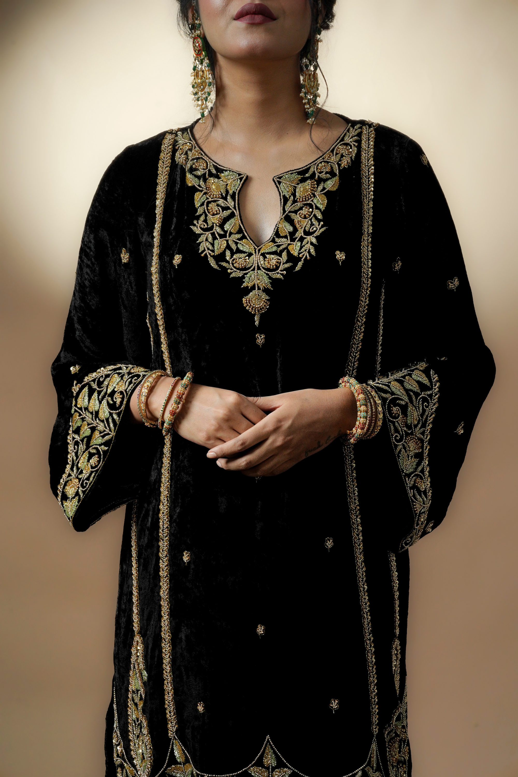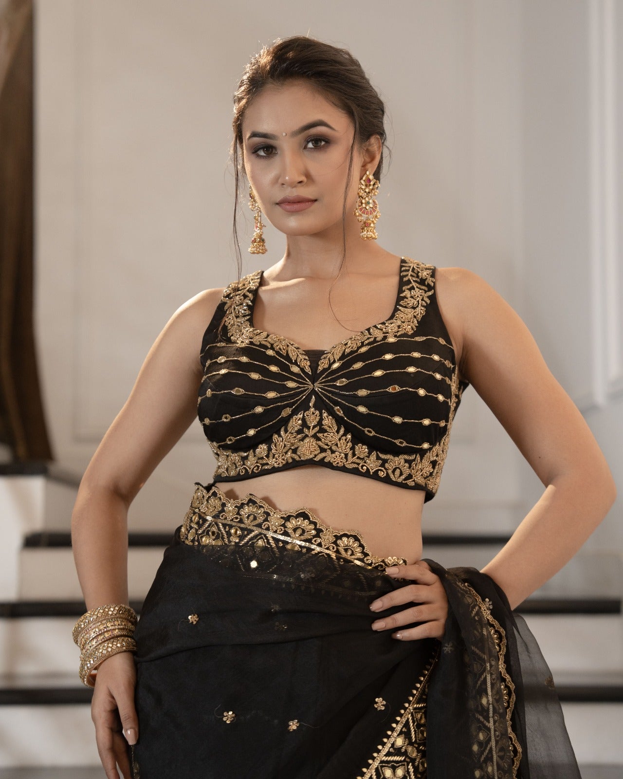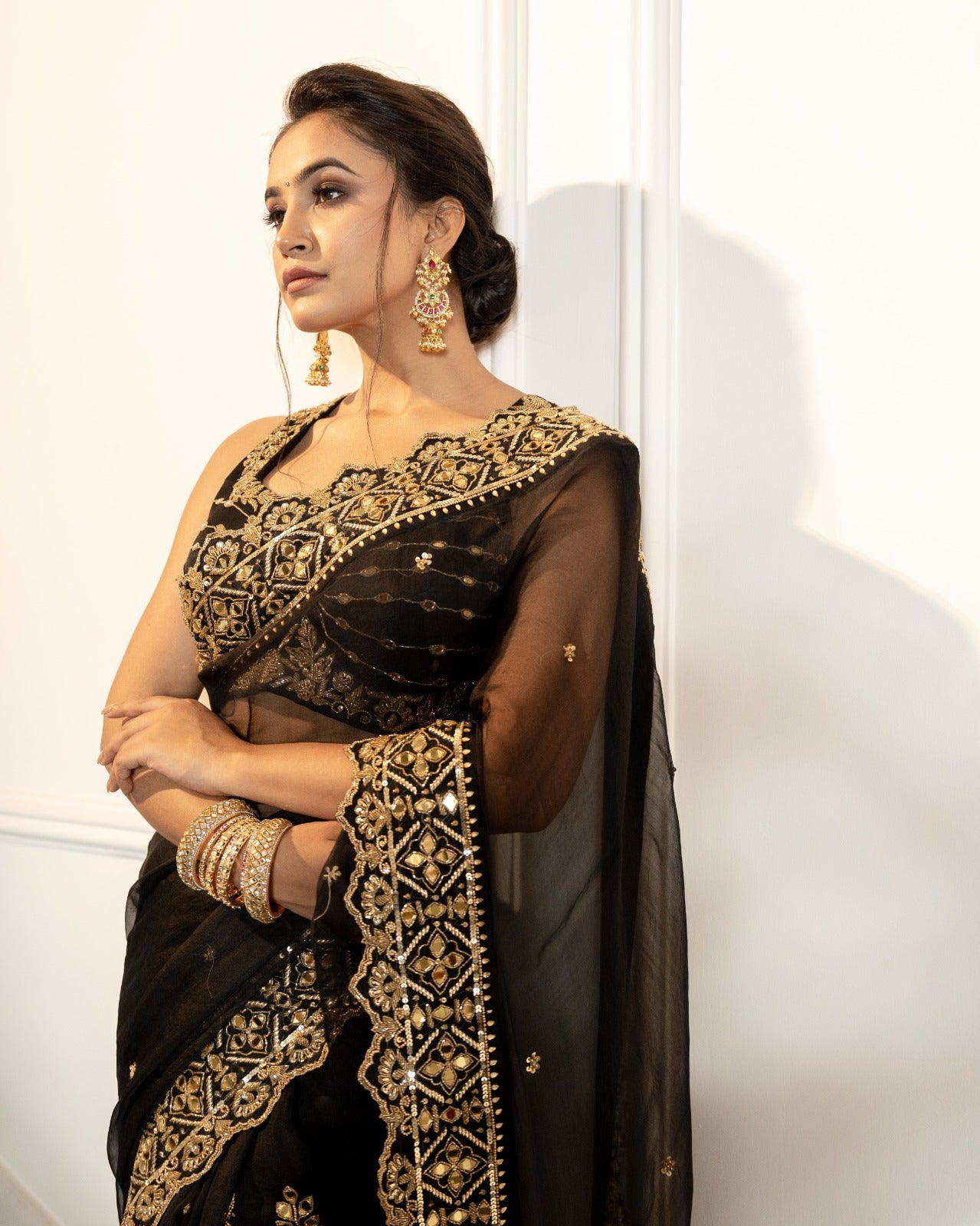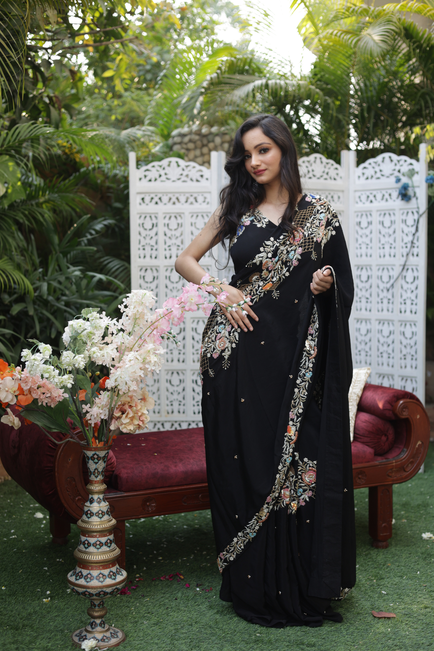 Black rajasthani embroidered mirrorwork saree and blouse set
