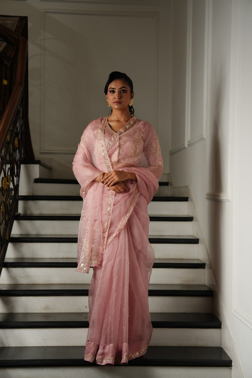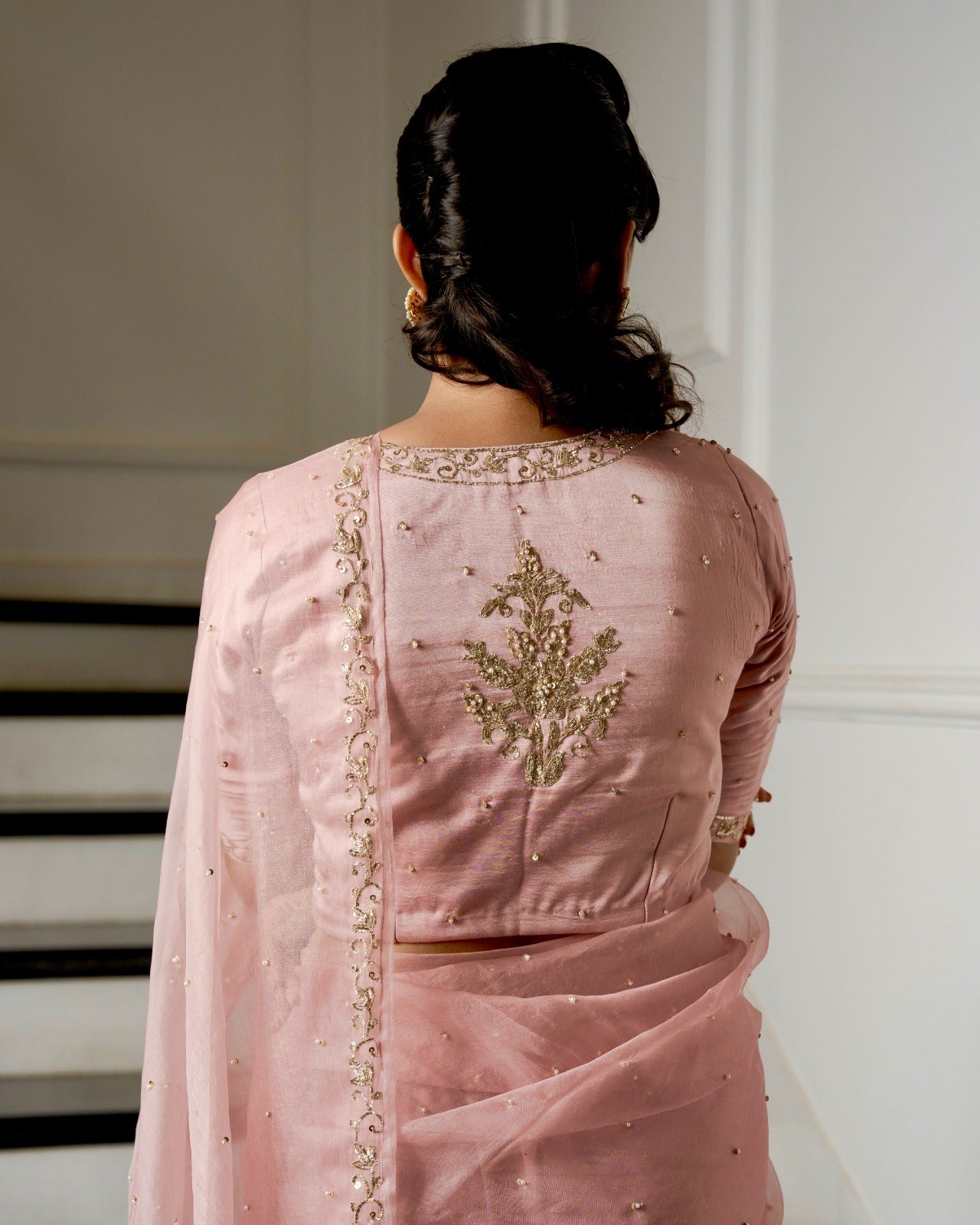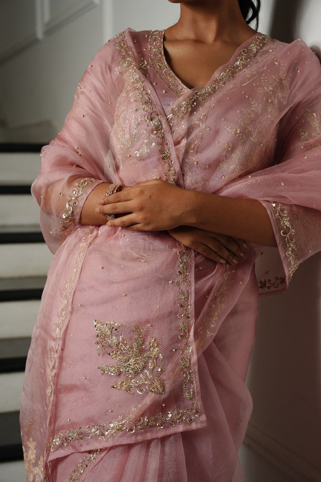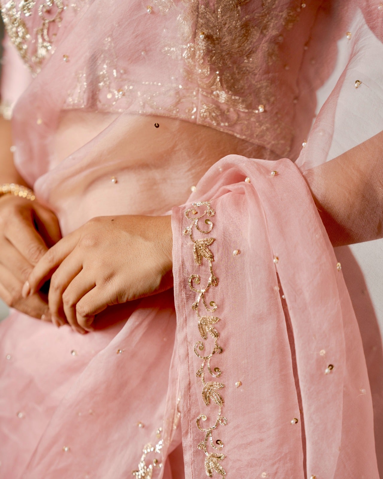 Powder Pink Zardozi Pitta Work Saree