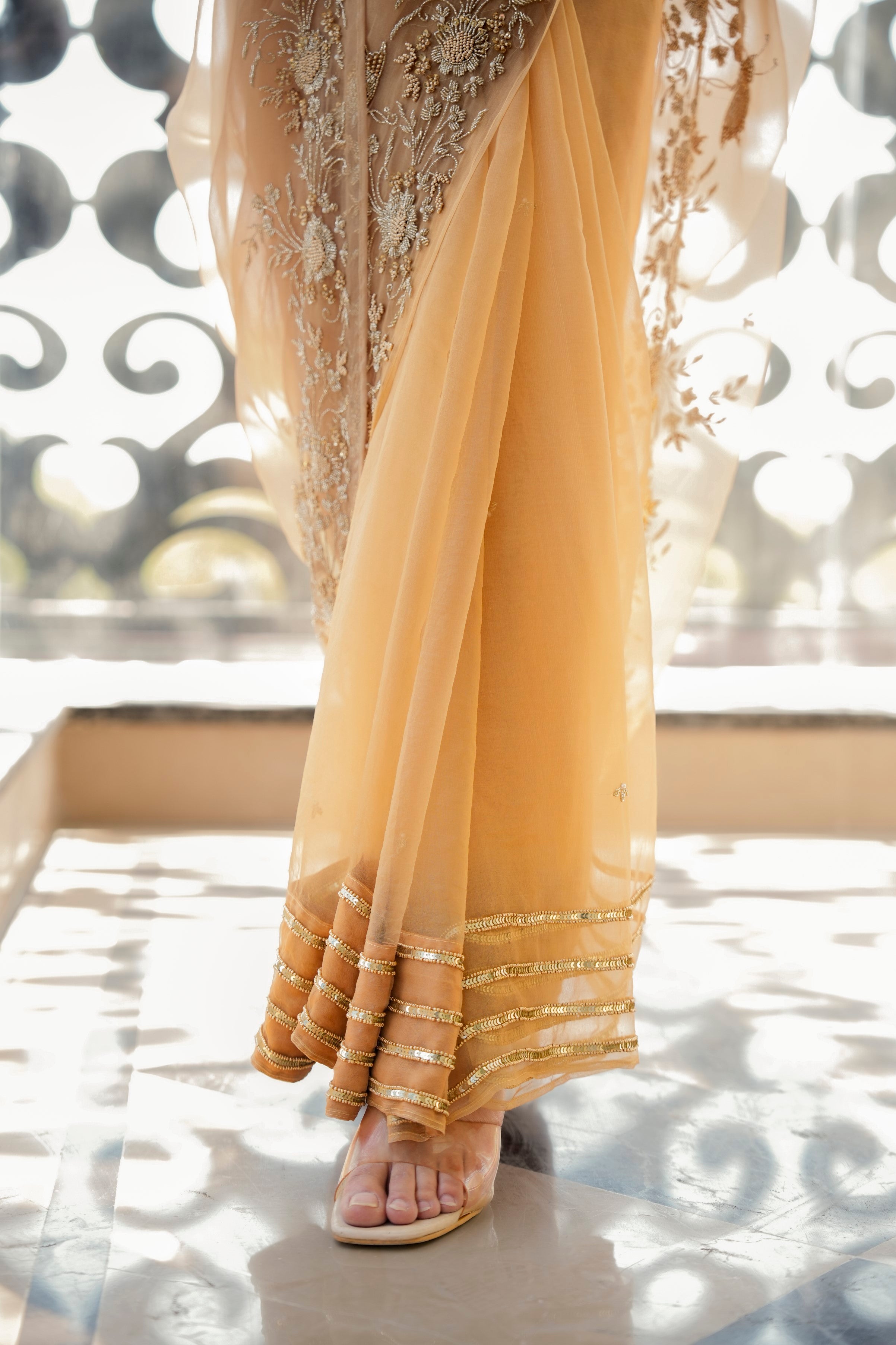 Sand beige organza saree-the saree features heavy hand embroidered zardozi work blouse paired with heavy hand embroidered border saree. The set includes a petticoat.