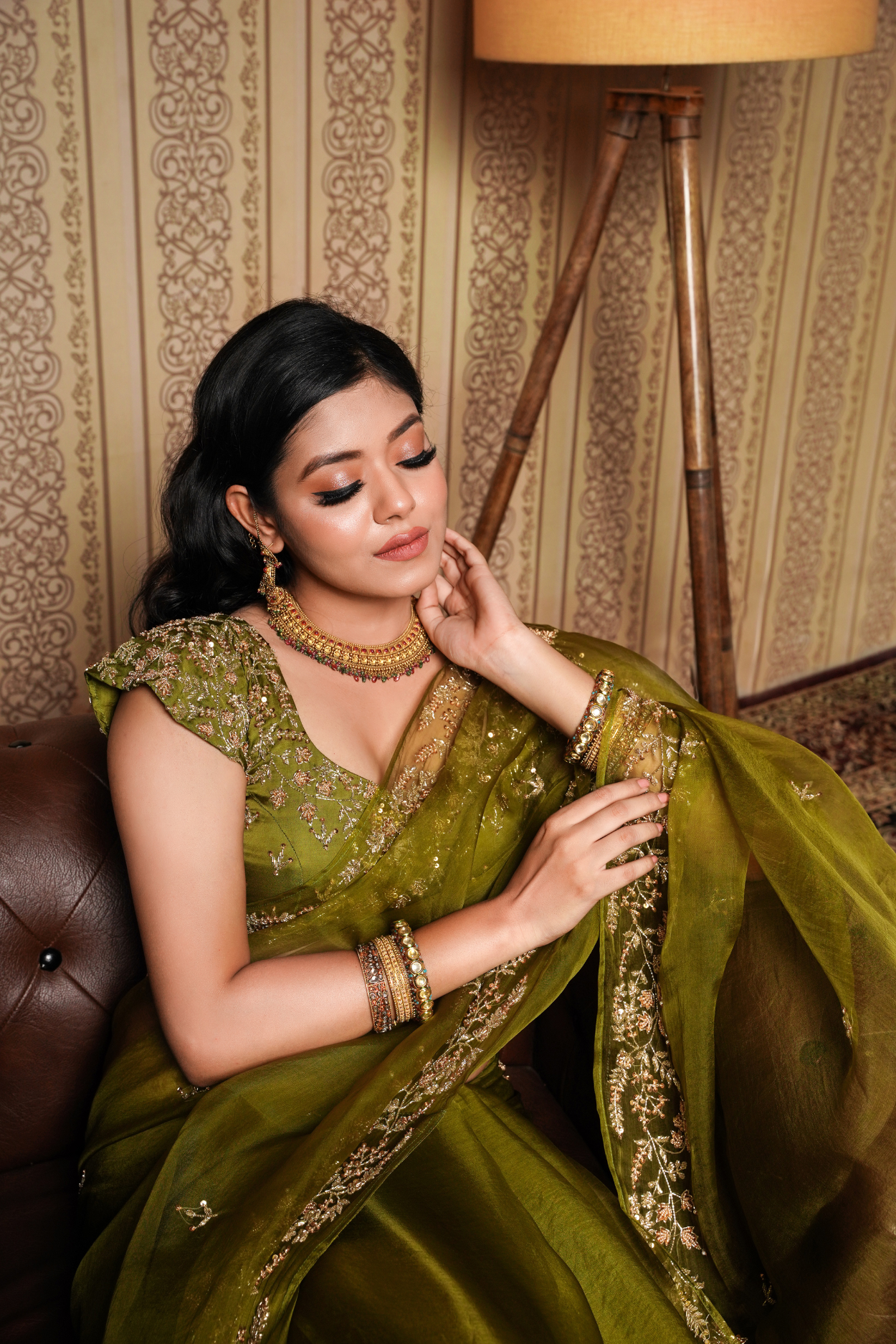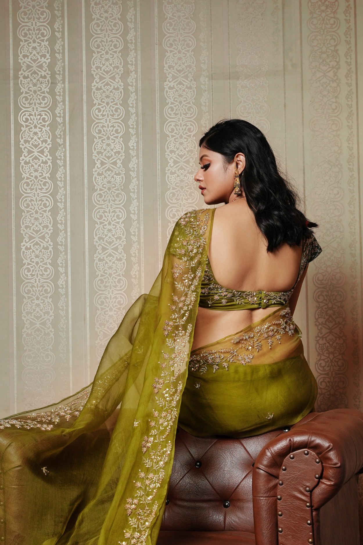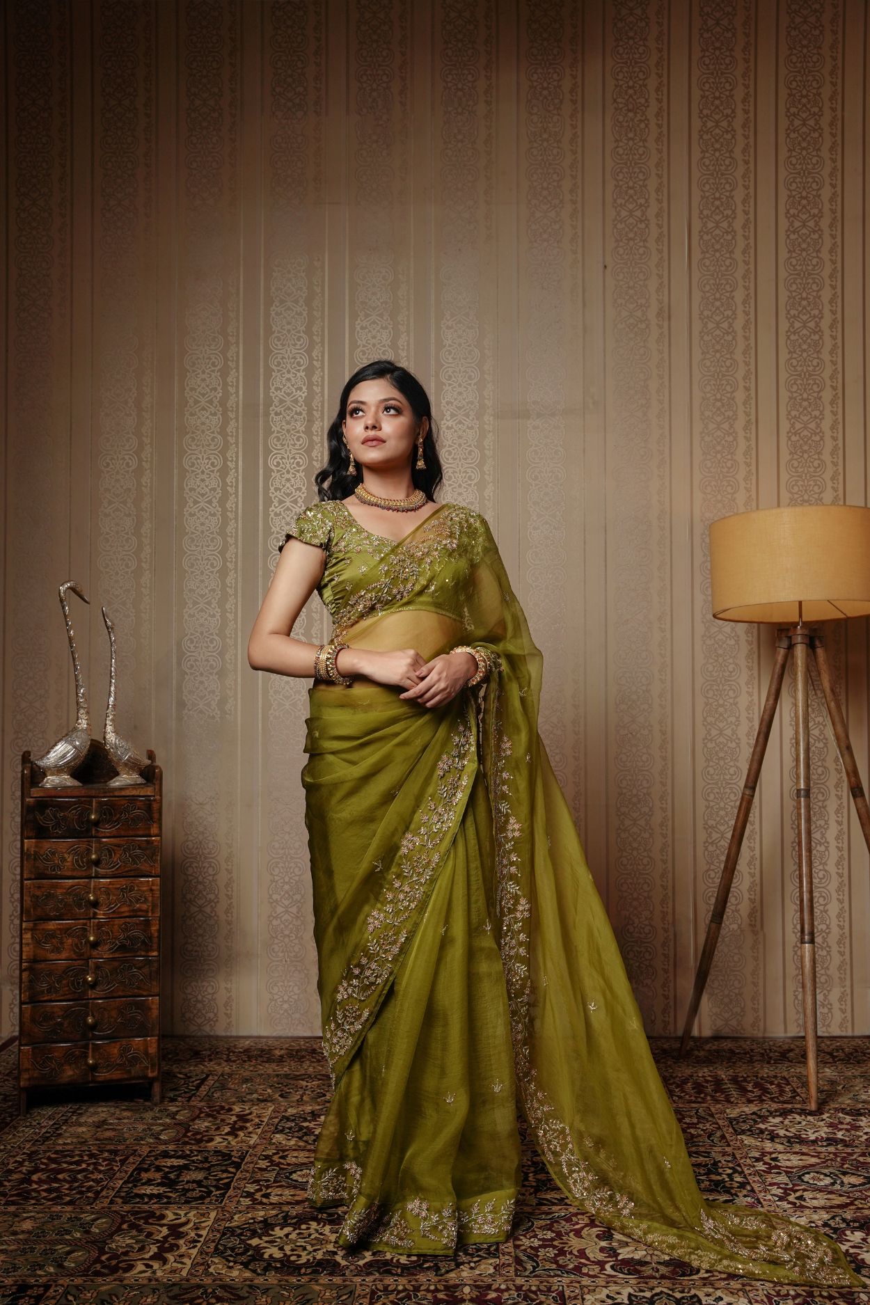 The saree is made in pure silk organza and features intricate hand-embroidered aari, cut dana, and sequin work. Blouse is made of satin silk.